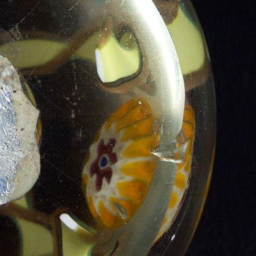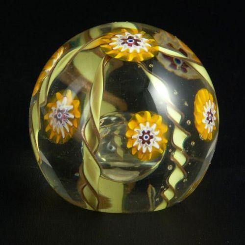 PAPERWEIGHT: Clear, having a series of “flowers” in a millefiori-like manner. In the center at the b