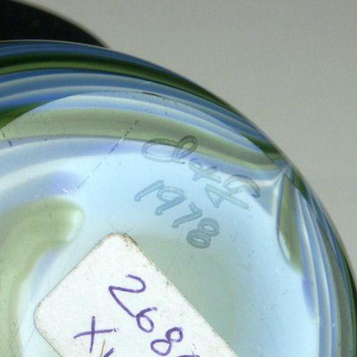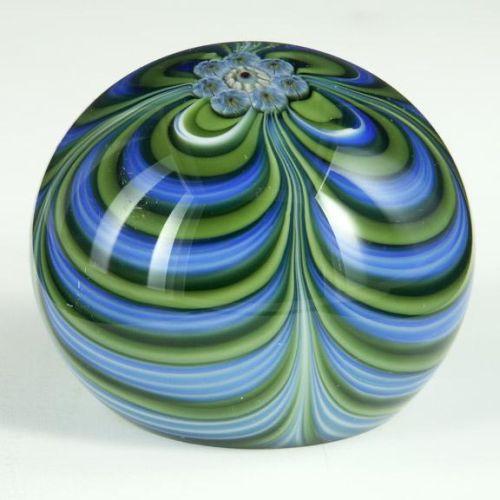 PAPERWEIGHT: Paperweight having a spreading motif just below the surface in alternating sea blue and chartreuse in a wave-like action covering the entire paperweight. The top center is a single millefiori. Signed “J and G 1978”.