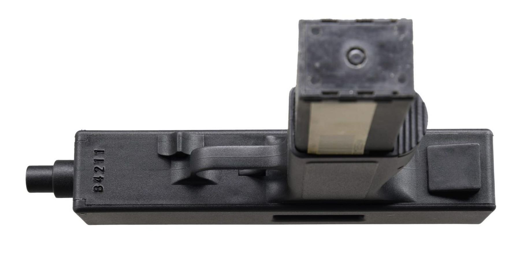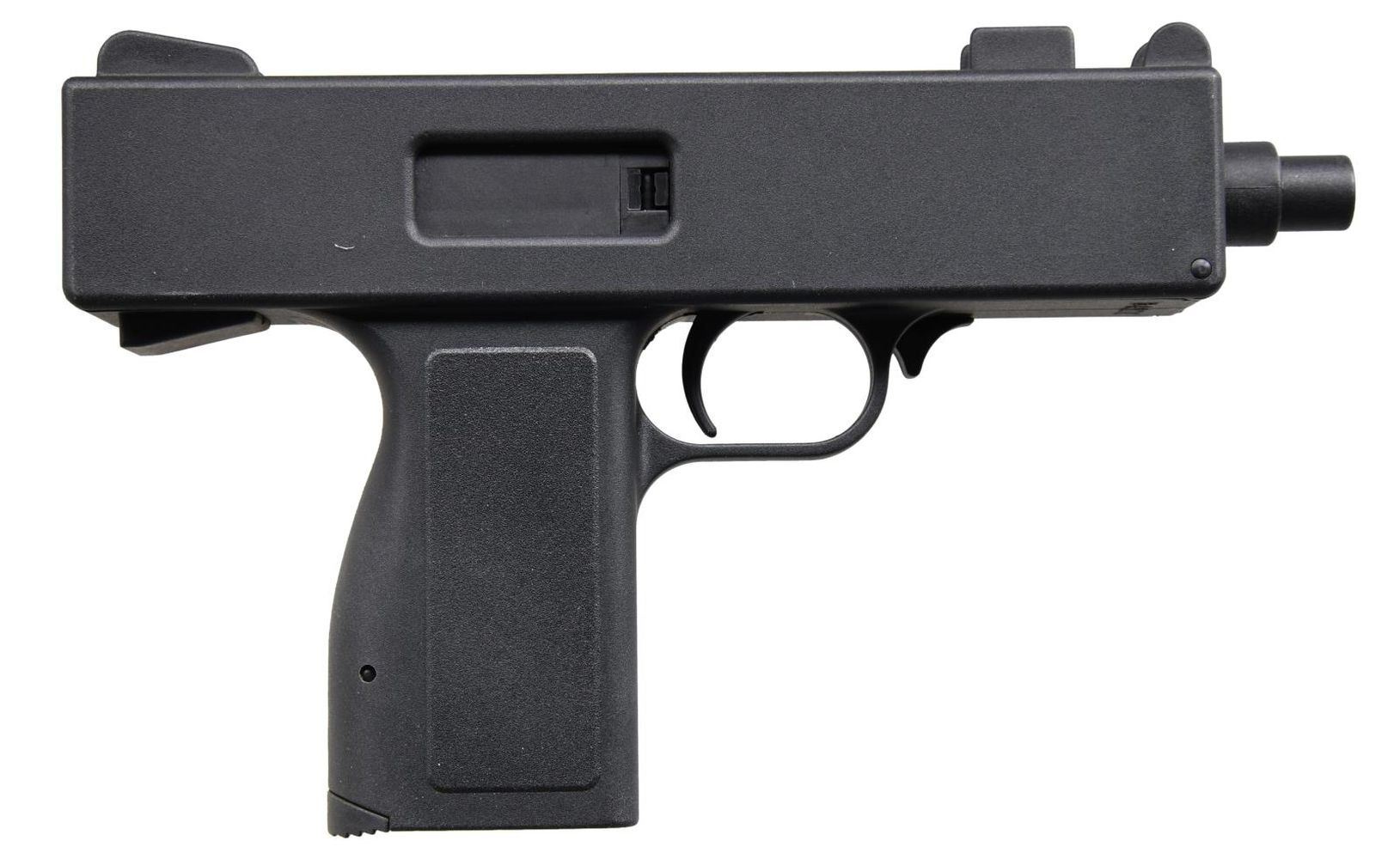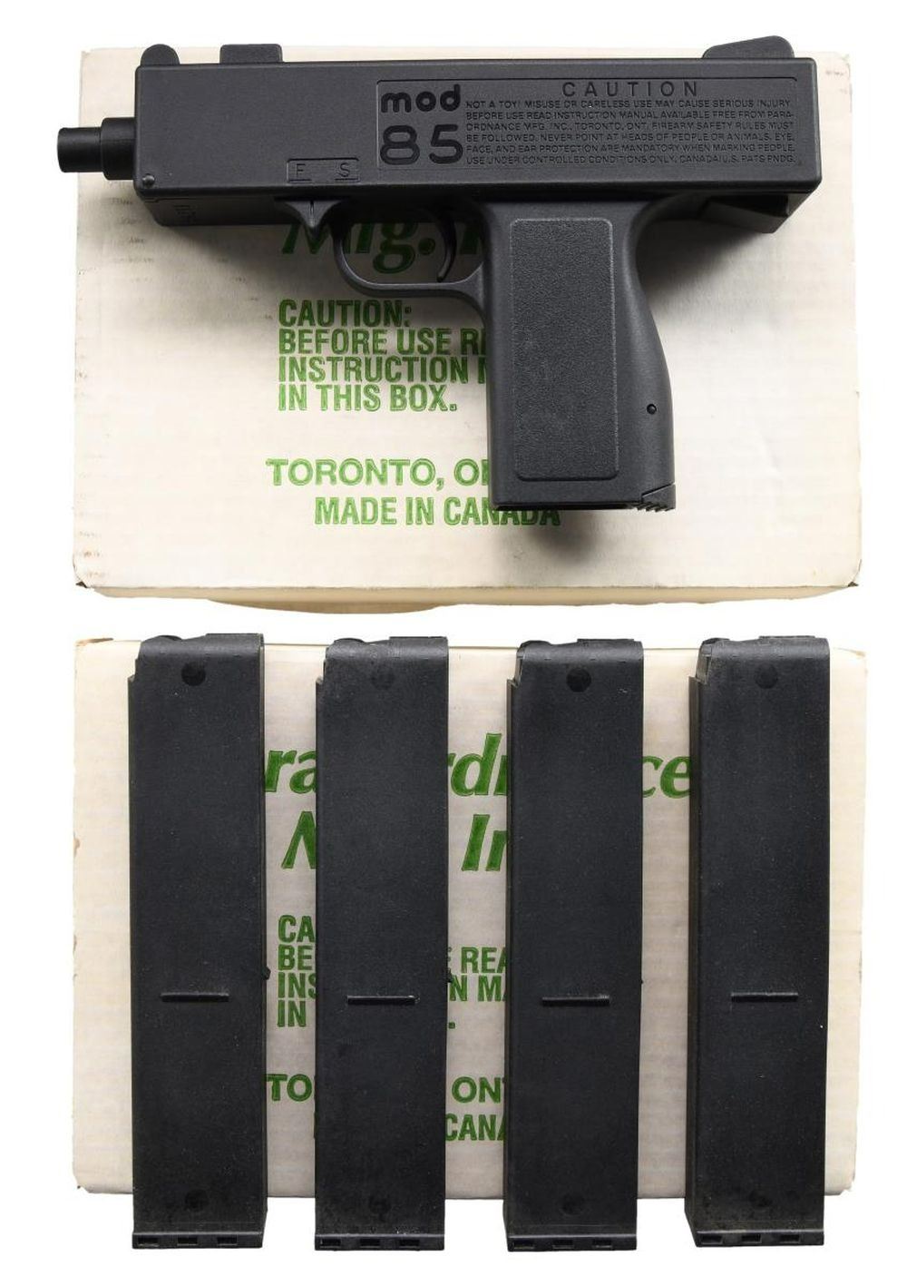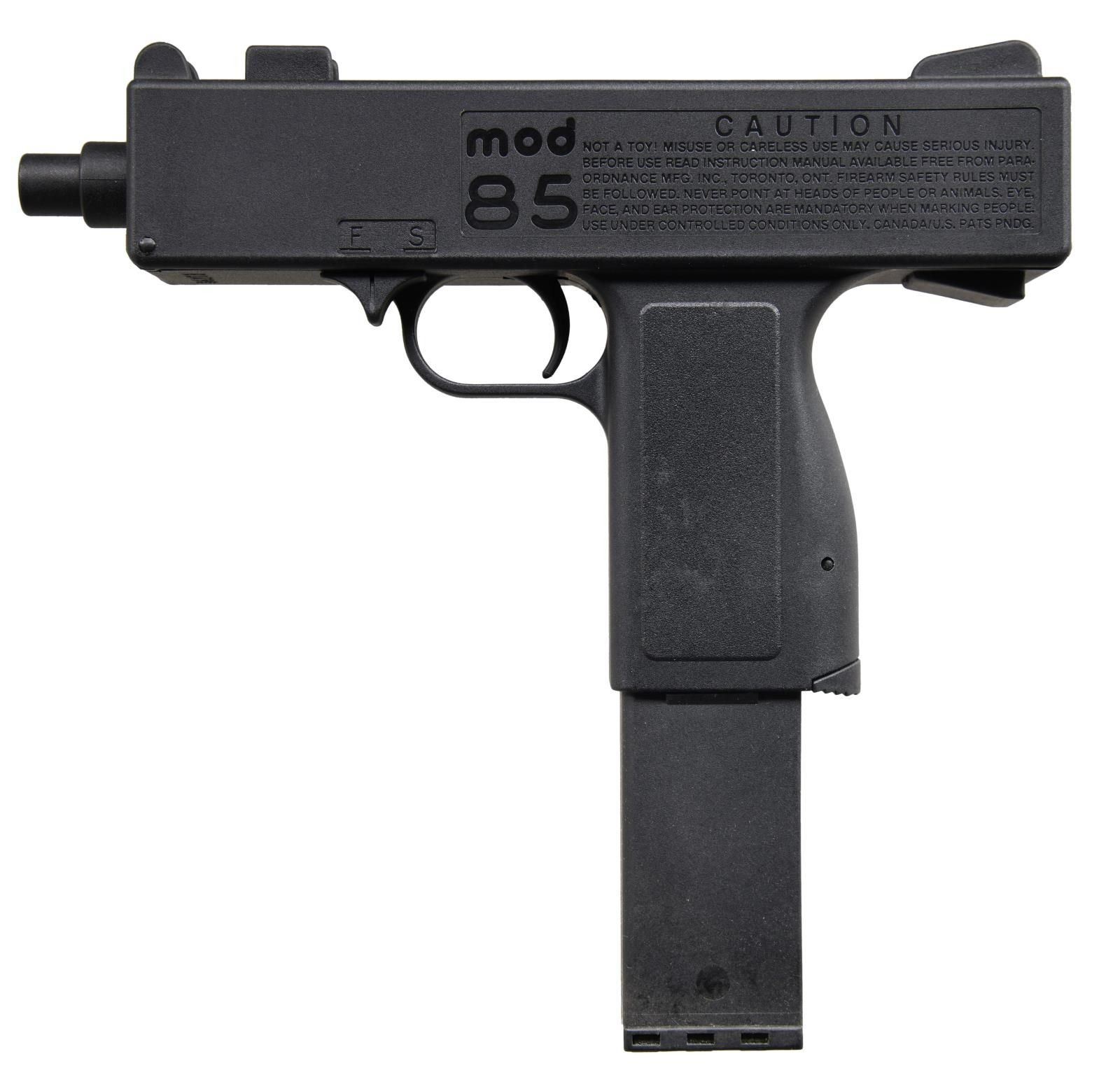 PAINTBALL MACHINE GUN. Cal. .375 Paintball. S# B4211. Bbl. 5" rifled plastic. Mfg. mid to late-1980s in Canada as law enforcement training aid. Replica of MAC-11 that shoots .375" (non-standard) dye-marking gelatin paintballs at approx. 400 fps. Magazines also approximate MAC-11's but are slightly larger with a 24-rd. capacity. Plastic cartridges (none included) hold the paintballs, which are propelled by large pistol primers. Possibly, a 3D printer file is available for the casings. Operates full auto from an open bolt like a MAC-11. All components (except springs and pins) are of black synthetic construction, including the barrel. MAGS: 4 of 24 rds. each. UNATTACHED ACCESSORIES: original box and instructions plus another box for #B4210. CONDITION: all items are near excellent, including bore. PROVENANCE: the lifelong collection of Terrance McCarty. (02-21789/NW). MODERN. $100-200.