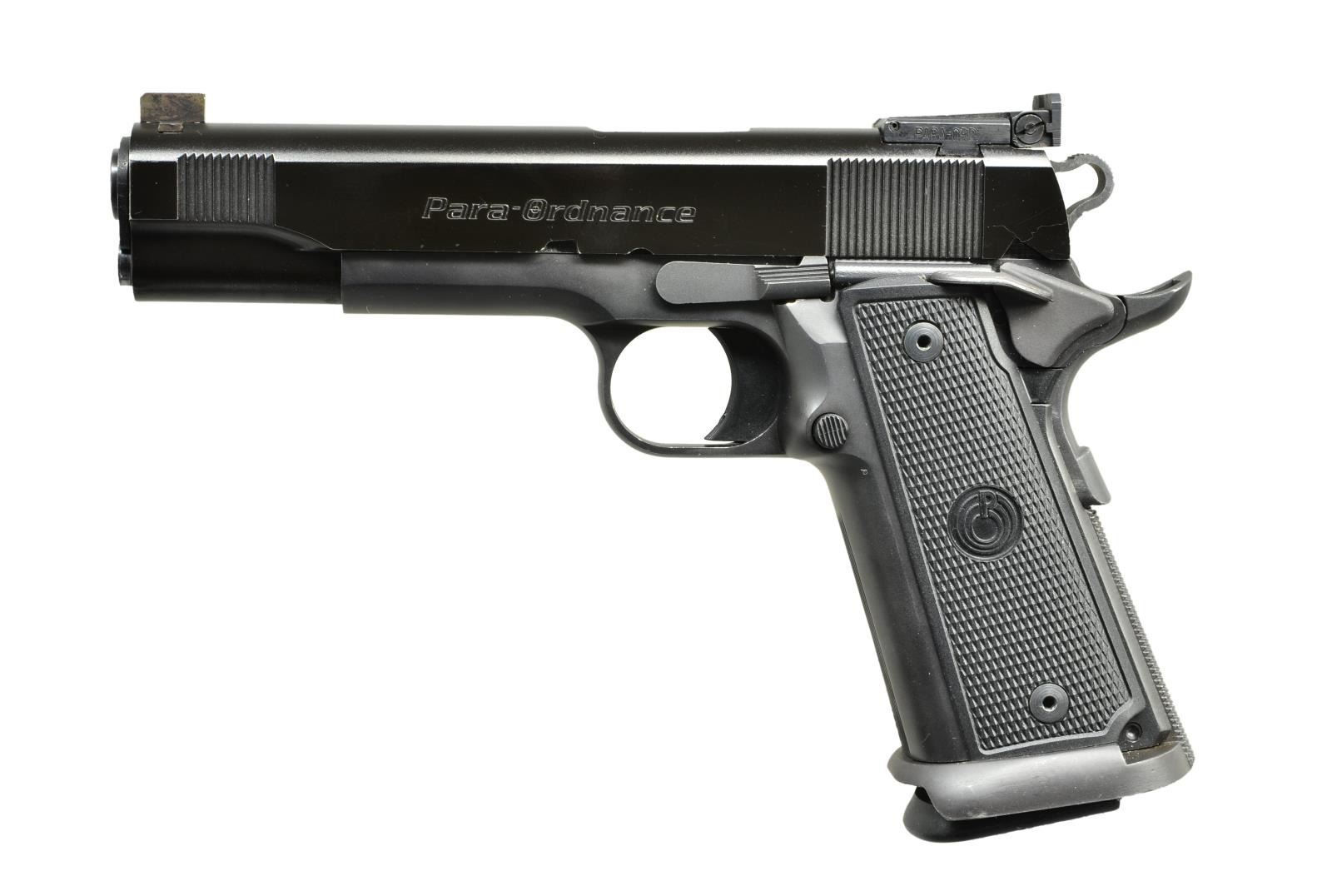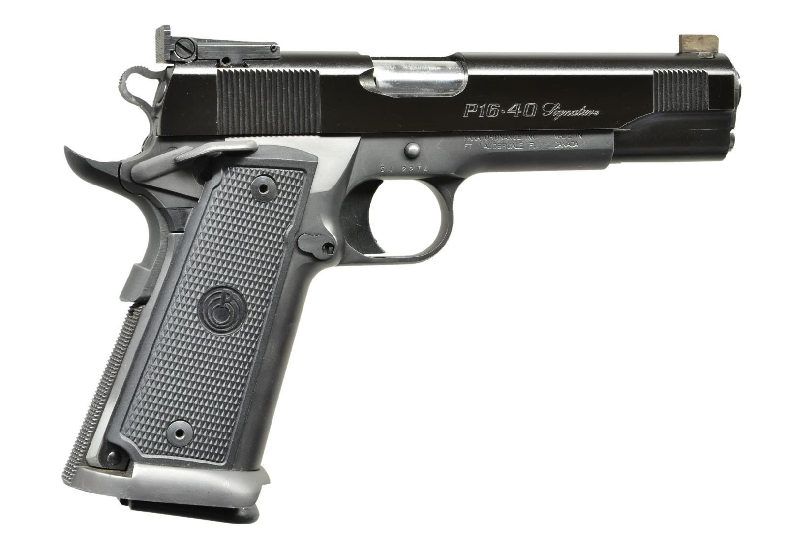 Cal. 40 S&W. S# SJ2274. A competitive shooting style pistol featuring a 5" bbl., tall blade front sight. adj. square notch rear sight, skeletonized hammer, & extended beavertail grip safety. Black finished slide & blue finished double stack frame w/ 1911 style controls, grooved front strap, 2 piece checkered grips & integral flare mag. well. Mfg. in Canada. MAGS: 5 - 16 rd. UNATTACHED ACCESSORIES: manual. CONDITION: Very good overall appearance w/ light handling marks throughout. Very good bore. PROVENANCE: Estate collection of Fred Inganamort. (22-1762/MD). MODERN. $500-900.
