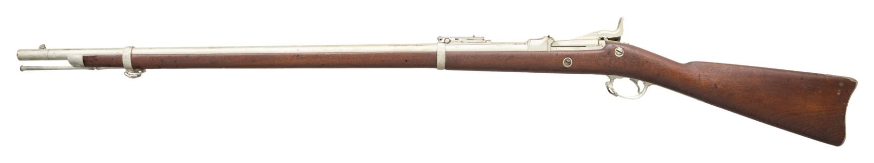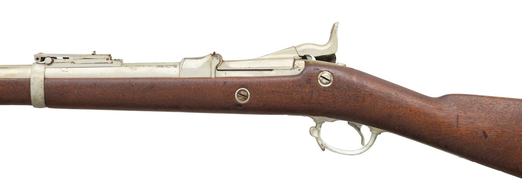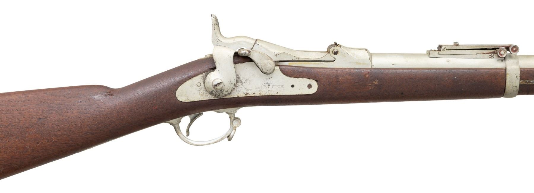 RIFLE. Cal. 45-70. S# 207959. Bbl. 32 5/8". Barleycorn front sight & Buffington rifle rear sight. 1884 Dated, low arch breechblock. Walnut stock w/ ramrod. CONDITION: metal has flaking white patina with patina & marks. Sanded & refinished wood shows sm. cracks & marks. Good rifling with light pitting & dark spots. (01-27359/MD). ANTIQUE. $350-500.