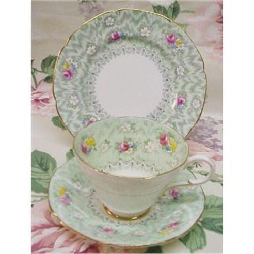 SUPERB QUALITY 3 PIECE SET CUP, SAUCER AND 6" PLATE,DEPICTING BEAUTIFUL PASTEL GREEN BACKGROUND ADORNED WITH THE PRETTY HAND PAINTED FLOWERS IN CHINTZ STYLE DECORATON, as per images,MADE BY PARAGON (please old mark) FROM FINE BONE CHINA OF ENGLAND, EXCELLENT USED CONDITION , US BUYER TO PAY 7.00 FOR SHIPPING PLUS INSURANCE.THANKS.