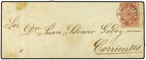 1a 1877 (28 Ago.) ASUNCION a CORRIENTES (Argentina). 1 real rosa, borde derecho de hoja, pequeños defectos en el margen superior. Muy rara destinación, la mayoría de las pocas cartas conocidas están dirigidas de Buenos Aires.