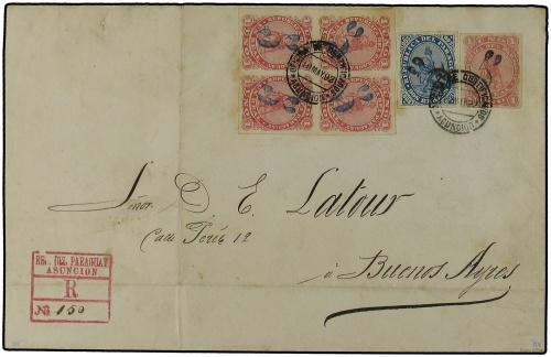 1892 (May 19) Registered cover addressed to Latour in Buenos Ayres franked by 1892 re-issue of 1878 surcharged in black ´5´ on 1r. rose and block of four surcharged in blue, alongside ´5´ in black on 2r. bright blue all tied by Asuncion cds´s. Reverse with two ´Certificados´ arrivals (May 26). A very rare cover. Cert. Moorhouse. Scott 4,5,5F.