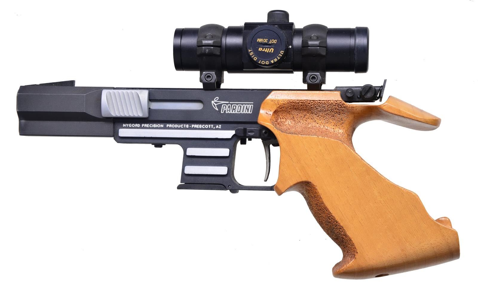 Cal. 22 LR. S# B6068. Bbl. 4.92". Mfg. 2001 in Italy & distributed by Nygord Precision Products of Prescott, AZ. Earlier model w/ mechanical trigger. Bbl. shroud grooved & fitted w/ Ultra Dot red dot sight having 30mm body in Burris rings. Adj. target sights w/ squared Patridge style front sight & wide bladed adj. rear. Matte black finish w/ natural aluminum decorative bars on sides & natural aluminum writing. Almost straight, fully adj. trigger. Light colored hardwood grip relieved for hand surrounding w/ recessed areas stippled. Comfortable fit for man's large sized hand. MAGS: 7 factory 5 rd. UNATTACHED ACCESSORIES: Dillon black nylon carry bag. Black factory case w/ manual & Allen wrenches. CONDITION: light firing residue in action. All other aspects near excellent including bore & grips. PROVENANCE: From the Frederic W. Thrane Collection. (20-2436/NW). MODERN. $1,000-1,500.