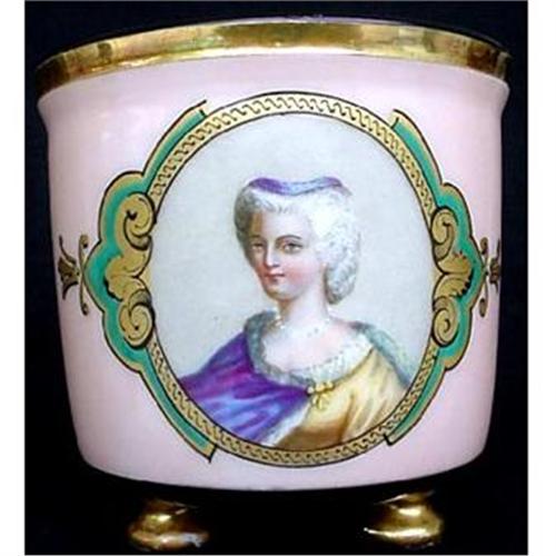 Miniature portrait on Old Paris porcelain, made in 19th century France. Measures 4" high. Cylindrical in form. Pale pink/salmon colour. Central medallion surrounded by gold and green borders and fleur de lis. Inside is portrait of a French noblewoman or court beauty, wearing the royal colours of yellow and purple. Very French features and attire. Very finely painted detail. Stands on 3 gilded knob-shaped feet. Condition is good.