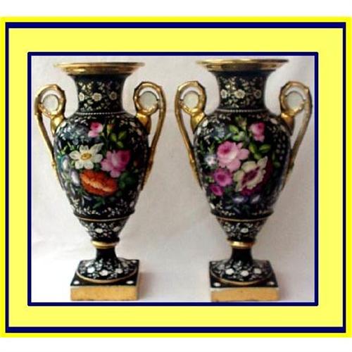 Outstanding pair of vases made in France by Sevres or related Old Paris factory, 19th century. Just under 11inches high and width of base is 3 1/4inch. Square gilded bases with urn shaped vases. Scrolling handles beginning with spear shaped leaves are entirely gilded except for the moulded sun faces inside the scrolls. Black ground covered in a host of tiny gold and white flowers. The biggest area of both front and back of each vase is handpainted with a magnificent floral still life. Roses, daffodils, morning glory, anemone, blue cornflowers etc. This is outstanding painting of the highest quality. One vase has a long, thin crack on the section below the painted area. There is also a fair amount of wear to the gilding on the base and bottom protruding rim, but not to the gilding on the vase itself and definately not affecting the beautiful flowers in any way.