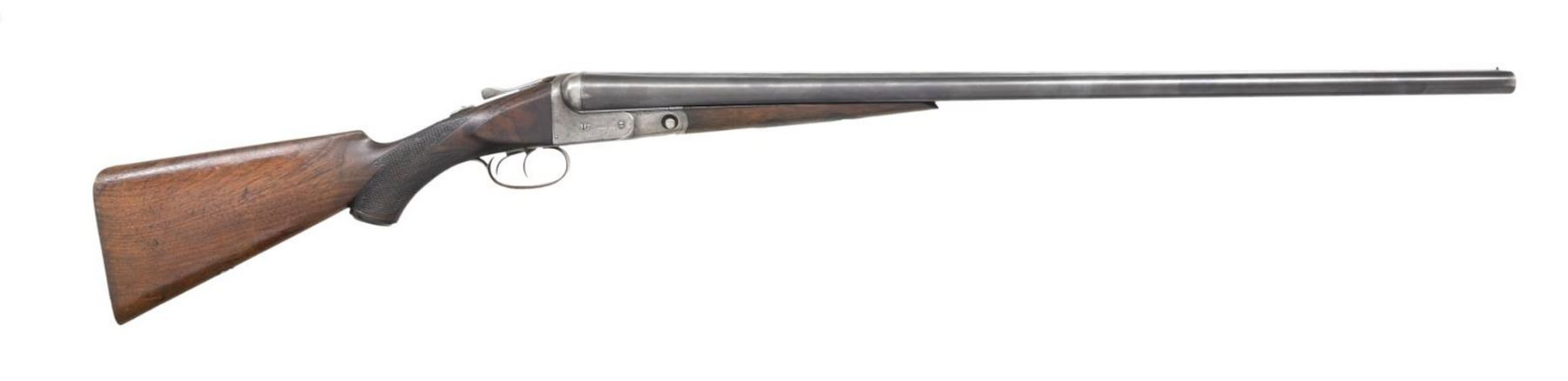 Cal. 12 Ga. 2-3/4". S# 145841. The 30" barrels have all correct Parker markings on matted rib and barrel flats. Rear lump is stamped with frame size "2". Typical Parker action with automatic safety and double triggers is engraved in usual "V" style. S# is on trigger guard tang. Parker capped pistol grip buttstock of plain American walnut measures 14" to end of wood. Buttplate is shattered but accompanies gun. Usual checkering and shield are present. Matching splinter forend has patent info on latch. MEASUREMENTS: BBLS: Bore Diameter: L .728. R .729. Restriction: L .033 (full). R .032 (full). Wall thickness: L .032. R .032. STOCK: DAH: 3". DAC: 1-3/4". CAST: neutral. LOP: 14". WEIGHT: 7 lb. 12 oz. UNATTACHED ACCESSORIES: shattered buttplate in plastic bag. CONDITION: good. Barrels retaining most of what appears to be their original blue. Action has traces of original case hardening color where protected. Stocks have about 40% original finish with many marks. Checkering worn. Bores show scattered pitting and overall frosting. Action is loose otherwise mechanically good. Repairs are evident with some infill at toe of stock. (23-5645/MGM). CURIO. $400-700.