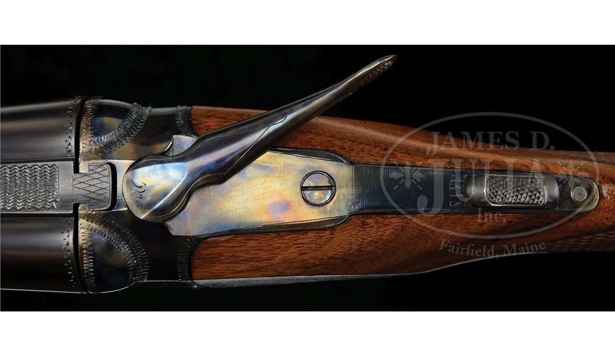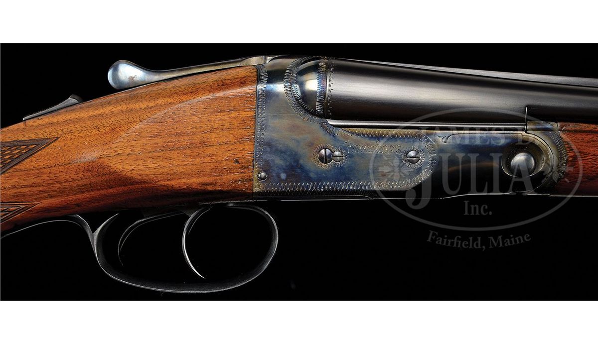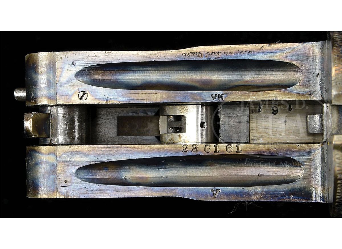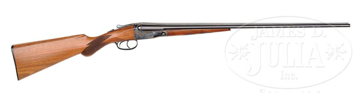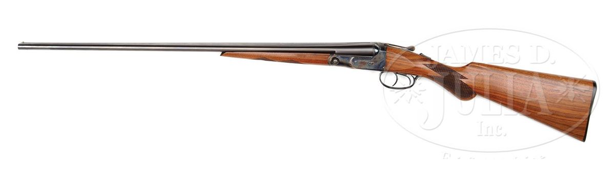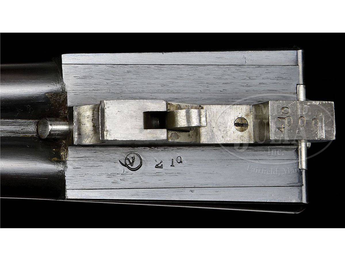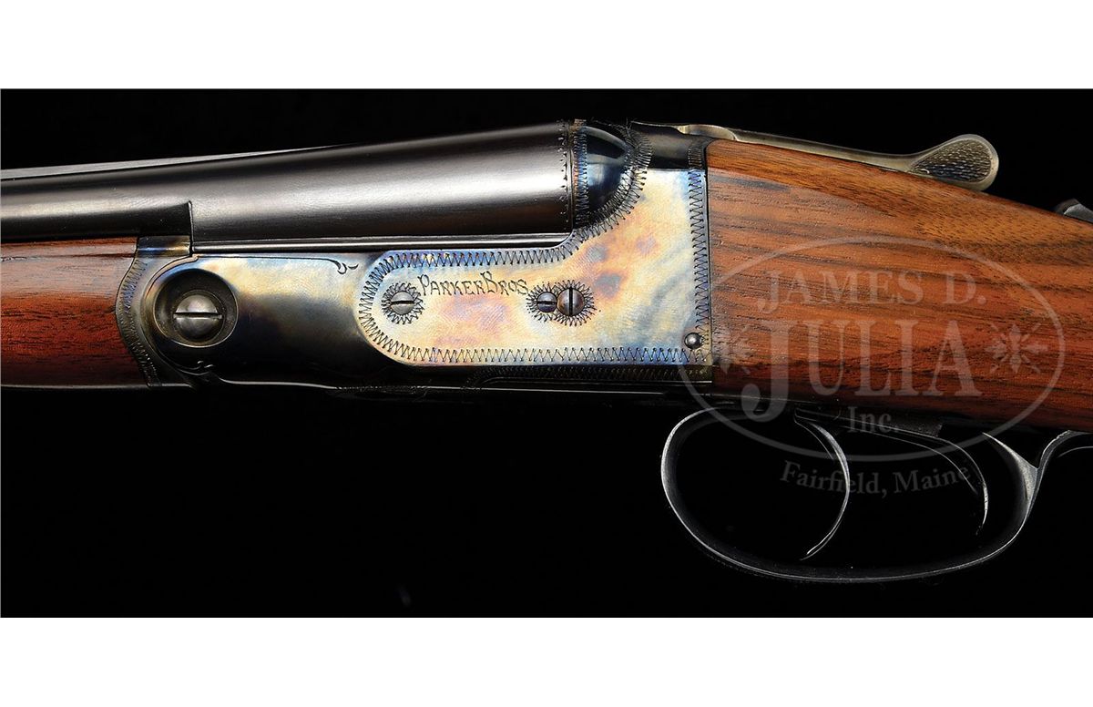 PLEASE NOTE (10-11-13): There is a small chip in the semi-pistol grip. SN 226161. Cal. .410. 3" Chambers. 000 Frame. 26" Bbls. This lovely little gun with all correct markings and specifications as outlined in PARKER GUN IDENTIFICATION & SERIALIZATION ledger, including ball grip, and Parkers dogs head buttplate, has had all of its orig finishes and engraving completely and competently restored. Gun features automatic safety and double triggers, along with splinter forend. Bore diameter at muzzles: left-.396, right -.396. Wall thickness: left -.035, right -.038. Drop at heel: 2-3/4", drop at comb: 1-3/8". Weight: 5 lbs. 9 oz. LOP: 14-3/8". CONDITION: Excellent, essentially as new, as restored, with only a few subsequent light handling marks. Bores are excellent. Action is tight. 4-49101 MGM292