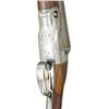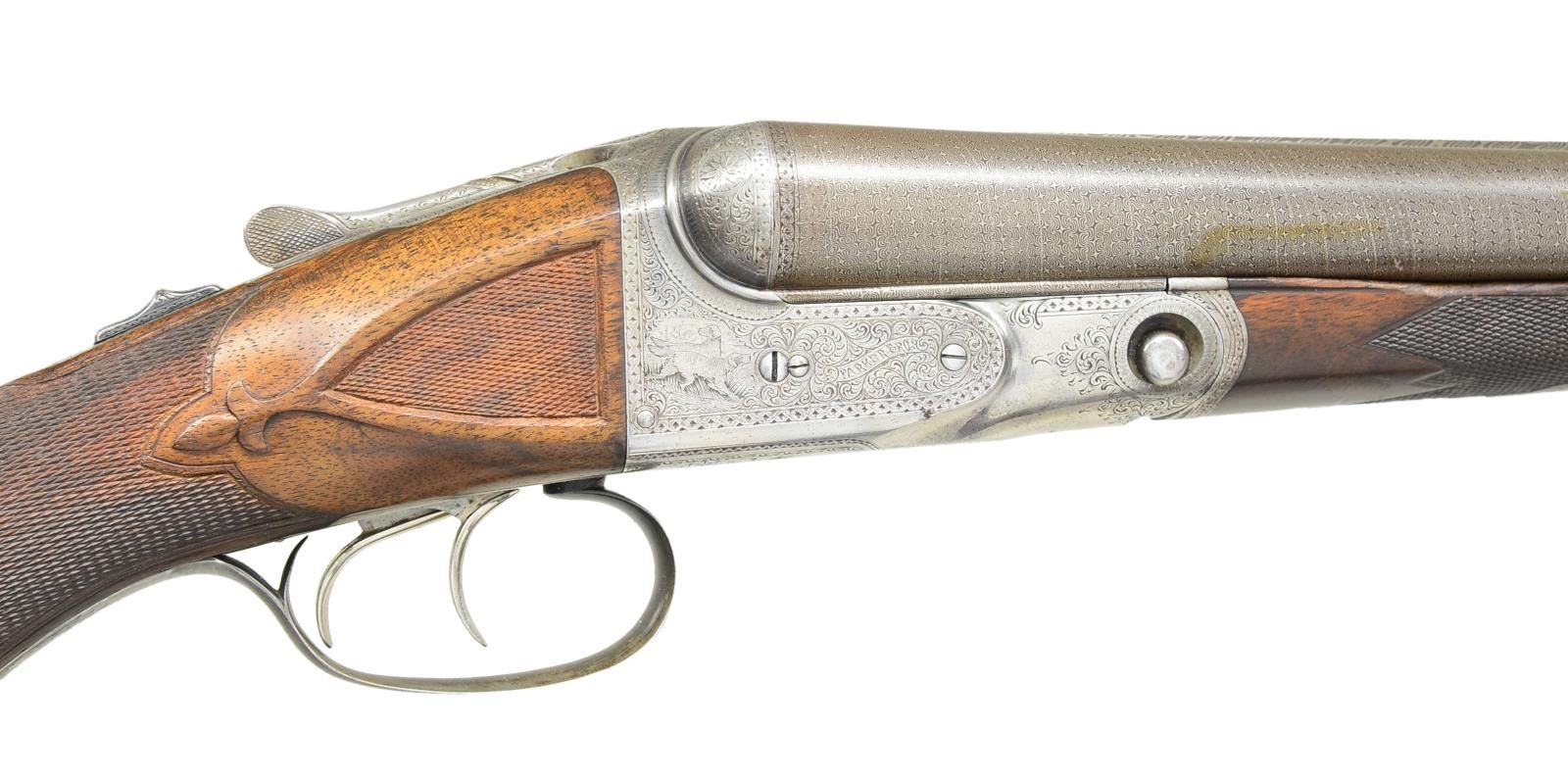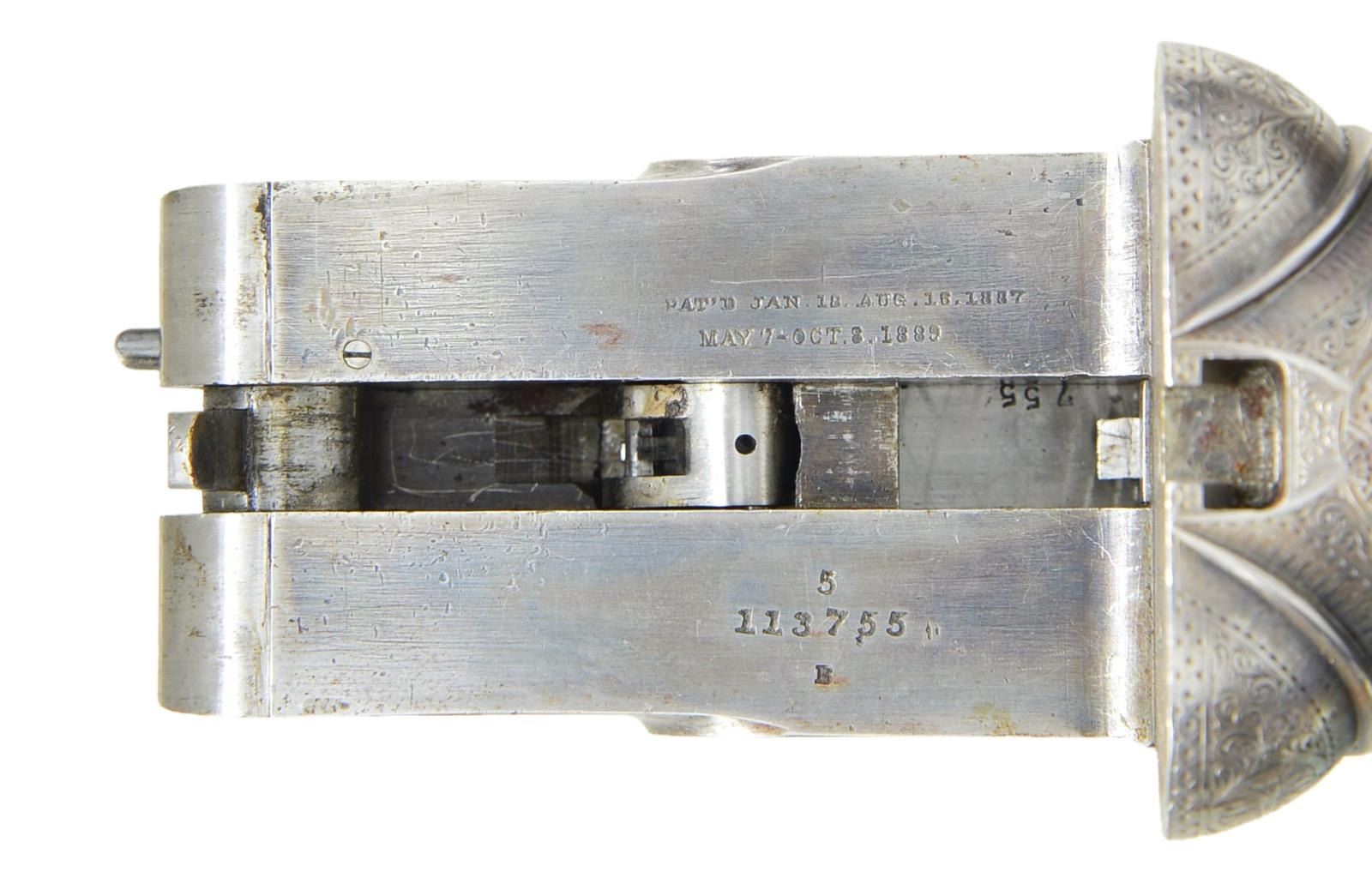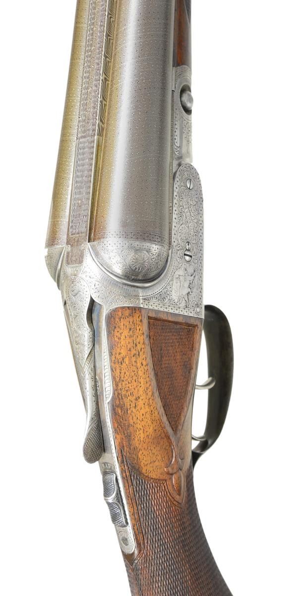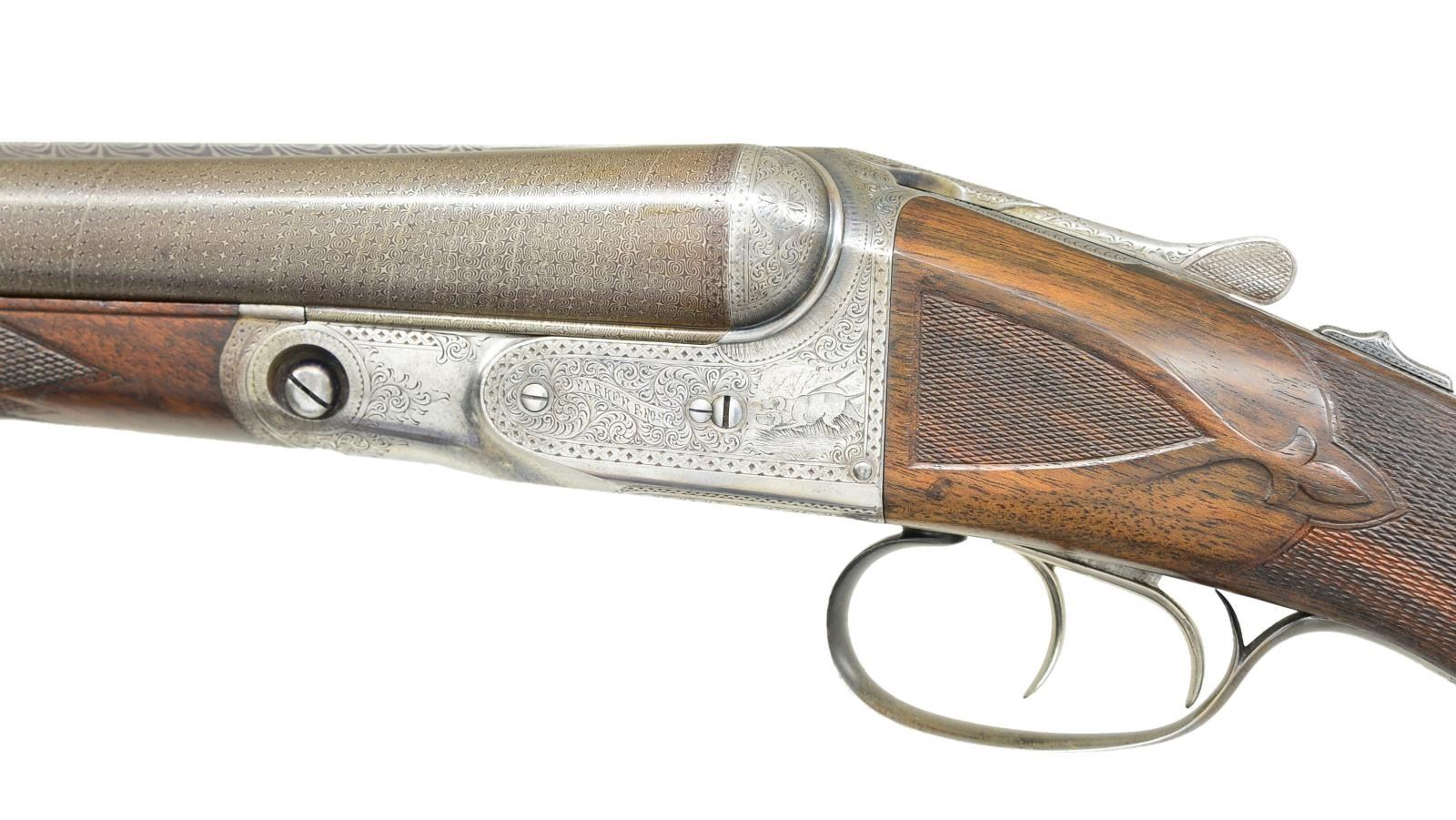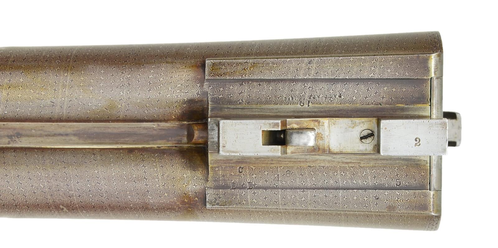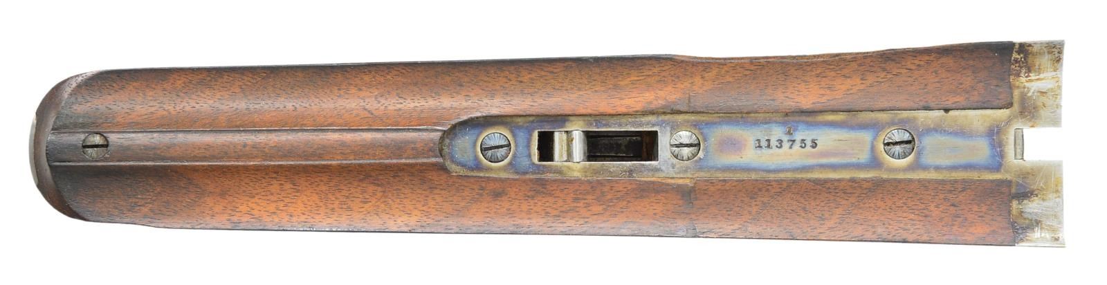ORIGINAL MONTE CARLO STOCK. Cal. 12 Ga., 2 5/8". S# 113755. Bbl. 30" w/ very attractive, closely patterned damascus is marked “PARKER BROS. MAKERS. MERIDIAN CONN. DAMASCUS STEEL” on flat matted slightly raised pigeon rib. The Parker Story indicates that 228 BH guns were made w/ damascus steel bbls. Bbl. flats & lumps are stamped w/ all correct markings including Frame Size "2", Grade "C" & "DD" for bbl. quality. Case hardened frame w/ all correct markings on water table features automatic safety & nickel plated dbl. triggers. Action is filed & engraved in typical "B" fashion w/ single beads around fences & dbl. dogs (pointers on left, setters on right) on sides surrounded by scroll. This gun is unusual in that the borders are of knot work design. Grade B guns normally have unique scenes on trigger plates; this gun depicts a fox on hill side, flushing a trio of turkeys. Broadly marbled European walnut pistol grip buttstock measures 14 1/4" over "London Guns" solid red pad & features unusual Monte Carlo comb of a style & shaping noted on other known Parker examples. Checkered side panels end in nicely carved fleur-de-lis. Fancy pattern grip checkering has semi-fleur-de-lis intrusions toward comb. Hard rubber grip cap has lg. inset gold oval plate on bottom. Matching splinter forend has filed steel tip & usual Deeley type release. Both forend iron & bbl. loop of this set are stamped “1”. The Parker Gun Identification Ledger relates that this gun came w/ an extra set of bbls., (not included w/ this lot). MEASUREMENTS: BORE DIA.: Left .733. Right .733. BORE RESTRICTIONS: Left .027 Mod. Right .024 Mod. WALL THICKNESS: Left .029. Right .029. DAH 3 5/16". Drop at Monte Carlo 2 1/4". DAC: 1 7/16". WEIGHT: 8 lbs. CONDITION: good as refinished, bbls. retaining nearly all of a very fine rebrown w/ excellent definition to intricate pattern. Action is mostly cleaned to bright silver w/ traces of case hardening color where protected. Stocks retain most of a well-done oil refinish. Checkering recut. Newer pad is not well fitted. Bores are fine w/ one or 2 scattered pits. Action is slightly loose. (21-2989/MGM). CURIO. $3,500-5,000.