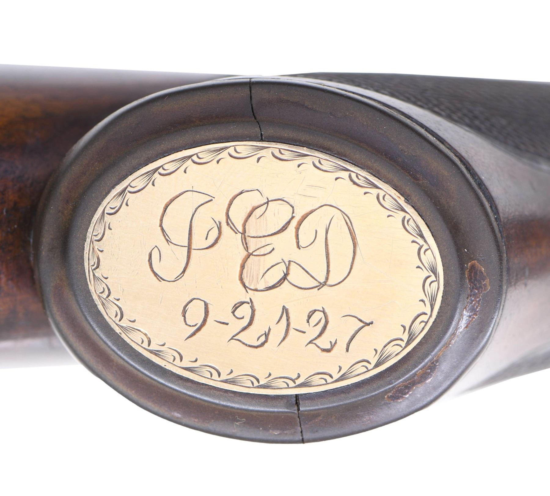 Cal. 12 ga. 2 3/4". S# 220769. Bbls. 28" of Acme Steel are marked "Overload Proved". Steel front bead. 1 1/2" frame. Case colored boxlock action w/ fancy fences & B grade factory engraving. Right side scene features two pointers. Left side features a setter & a pointer. Floorplate shows two flying geese. Balance of receiver has arabesque scroll engraving w/ fancy borders that continue to the trigger guard bow & forearm iron. Breech end of bbls. have borderline engraving. Aftermarket single selective trigger. Selective ejectors. Steel tipped splinter forearm & hard rubber capped pistol grip stock of nicely grained walnut w/ gloss finish & "B" grade hand checkering. Additional checkering on stock ears w/ fleur-de-lis finials. Brass plate on grip cap has an engraved border w/ initials "JED" over a date of "9-21-27". LOP: 13 3/16" over checkered butt w/ engraved skeleton steel buttplate. DAC: 1 5/8". DAH: 3". Stock has approx. 1/4" cast off. WEIGHT: 7 lbs, 5.6 oz. Mfg. 1927. Bore diameter: RT .729, LT .729. Choke constriction: RT .032, LT .010. Minimum wall thickness: RT .035, LT .033. CONDITION: bbls. retain 90% lightly faded blue showing small marks. Action has lightly visible case colors on its sides w/ fading in carry areas. Wood shows light finish & checkering wear w/ scattered small scratches & marks. Action is tight w/ top lever sitting right of center. Very good bright bores. (25-729/DS). CURIO. $8,500-10,000.