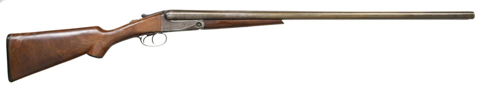 Cal. 12 Ga. S# 167471 (1914). Bbls. 30" w/ matte top rib replaced 2 1/2" from breech having no address. Brass front bead. Forcing cones has been reamed open. Size 2 frame marked "OV" on water table along w/ patent dates. Boxlock action w/ dbl. triggers, extractors & automatic safety. Splinter forearm & pistol grip stock. LOP: 14 1/8" to buttplate. CONDITION: bbls. have fair brown finish w/ large 5" area of solder repair to top rib, 3" area of polishing to bright metal on bottom of left bbl. & forearm lug showing solder reattachment. Markings on bbl. water table mostly obscured. Fair gray patina worn action w/ faint case colors on water table. Sanded & refinished wood has heavy floss finish, smooth checkering on forearm & numerous handling marks. Breech face has minute gap to action. Good shiny bores. (23-1273/MD). CURIO. $300-500.