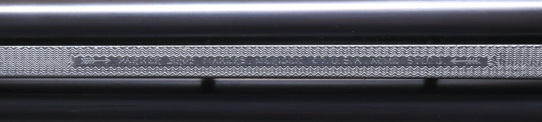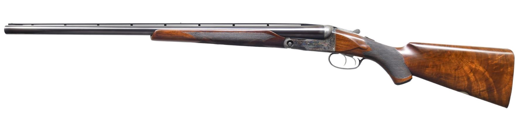 Cal. 12 ga. 2 3/4". S# 218241. Bbls. 26" of Acme Steel are marked "Overload Proved". Features include factory round post vent rib as well as fixed Skeet-in & Skeet-out chokes w/ white front & mid beads. Case colored 1 1/2" frame boxlock action w/ C grade engraving. Engraving features a scene w/ pointing setter on right side/ Left side scene features a pointer & floorplate features a marsh scene w/ a flying mallard. Balance of receiver has arabesque scroll engraving & fancy borders that continue to trigger guard & forearm iron. Breech end of bbls. have borderline engraving. Double triggers. Selective ejectors. Beavertail forearm & hard rubber capped pistol grip stock of fancy black walnut having satin finish, C grade checkering & oval nameplate in toeline. LOP: 14 1/8" to a checkered butt w/ engraved skeleton steel buttplate. DAC: 1 1/2". DAH: 2 1/8". Stock is approx. 1/4" cast off. WEIGHT: 7 lbs, 8.4 oz. Bore diameter: RT .729, LT .812. Choke constriction: RT .001, LT .006. Minimum wall thickness: RT .028, LT .018. Mfg. 1927. CONDITION: beautifully restored gun. Bbls. retain 99% reblued finish. Action retains 90% restored case colors showing some carry wear. Stock has very good refinish & checkering. Sound action. Very good bright bores. (25-728/DS). CURIO. $8,500-10,000
