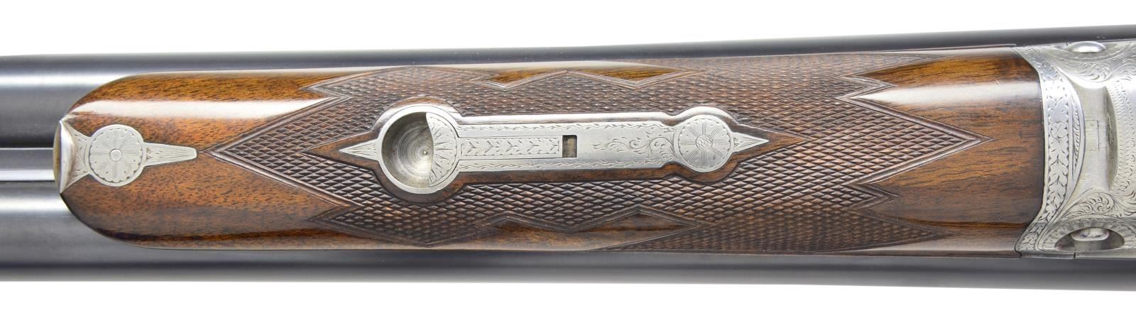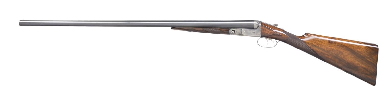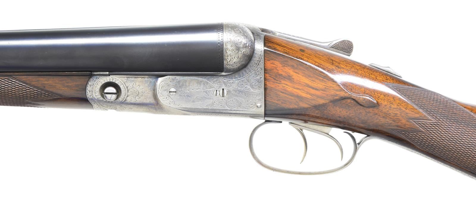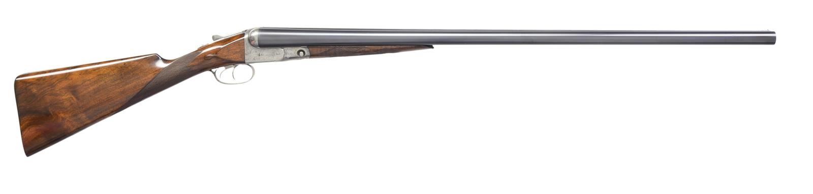 Cal. 10 Ga., 2 7/8". S# 144510. Bbls. 32" of Titanic steel. Steel front bead. Fixed Full & Full chokes. No. 3 frame case colored boxlock action. D Grade engraving features pointing dogs on sides of frame w/ flying water fowl on floorplate surrounded arabesque scroll & fancy borders. Banners on sides are marked "Parker Bros". Dbl. triggers. Extractors. Splinter forearm & straight grip stock of fine thin shell walnut having tear drop points, hand checkering & oval nameplate at toe line. LOP: 14 3/8" to skeleton steel checkered butt. WEIGHT: 10 lbs., 1.2 oz. Mfg. 1908. CONDITION: bbls. have over 98% fine reblued finish. Action is polished bright. Stock & forearm have very good gloss refinish w/ recut checkering showing a few scratches & marks. Nice bright bores. (19-4790/DS). CURIO. $2,500-3,500.