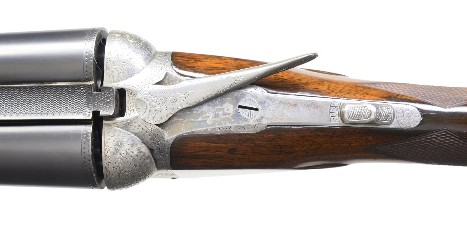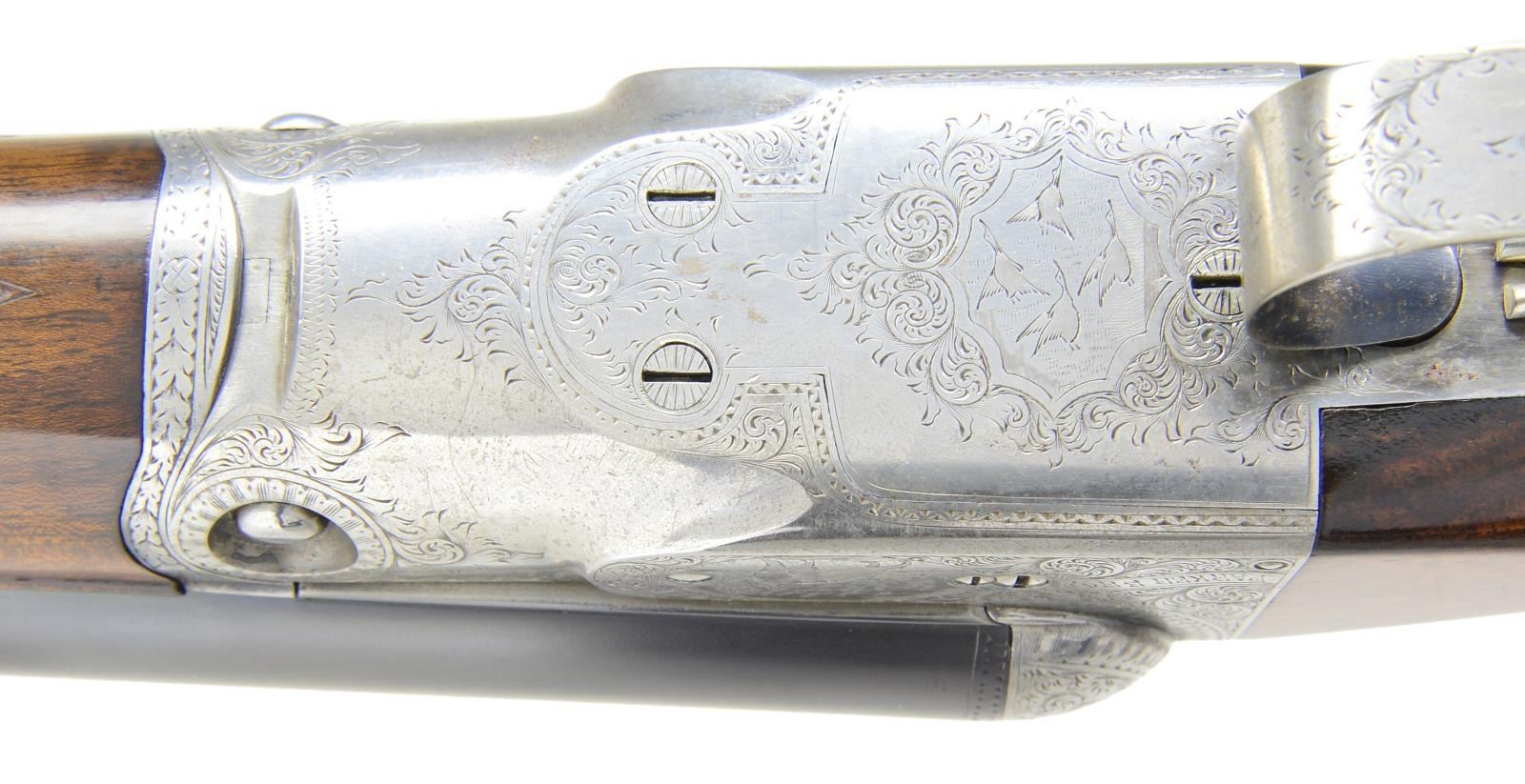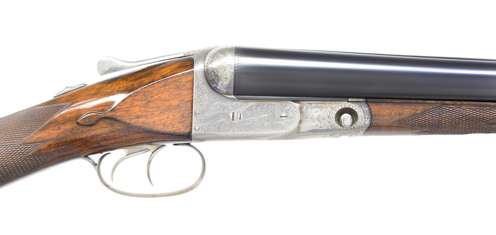 Cal. 10 Ga., 2 7/8". S# 144510. Bbls. 32" of Titanic steel. Steel front bead. Fixed Full & Full chokes. No. 3 frame case colored boxlock action. D Grade engraving features pointing dogs on sides of frame w/ flying water fowl on floorplate surrounded arabesque scroll & fancy borders. Banners on sides are marked "Parker Bros". Dbl. triggers. Extractors. Splinter forearm & straight grip stock of fine thin shell walnut having tear drop points, hand checkering & oval nameplate at toe line. LOP: 14 3/8" to skeleton steel checkered butt. WEIGHT: 10 lbs., 1.2 oz. Mfg. 1908. CONDITION: bbls. have over 98% fine reblued finish. Action is polished bright. Stock & forearm have very good gloss refinish w/ recut checkering showing a few scratches & marks. Nice bright bores. (19-4790/DS). CURIO. $2,500-3,500.