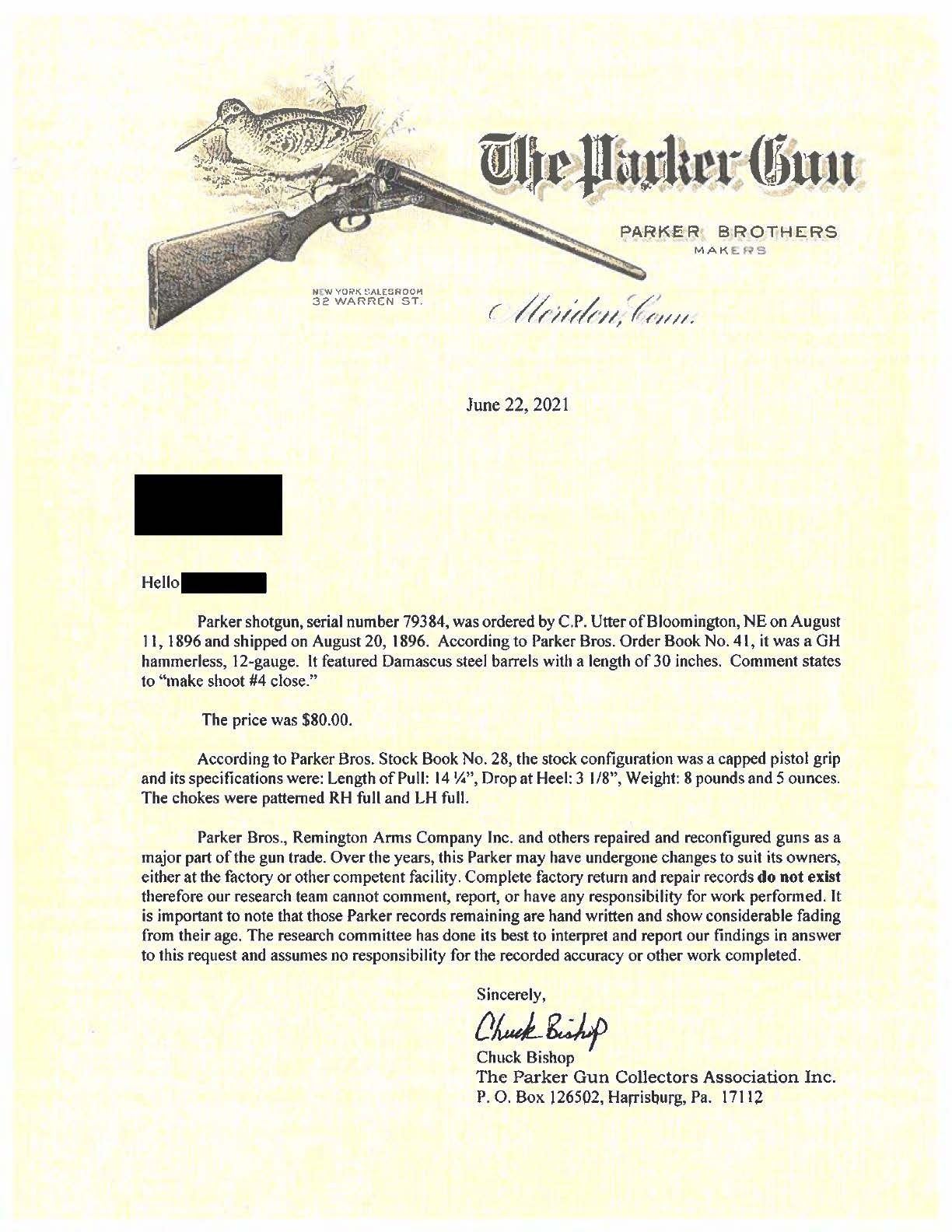 Cal. 12 ga. 2 3/4". S# 79384. Bbls. 30" of Damascus steel w/ fixed Full & Full chokes. Steel bead. Case colored boxlock action w/ G grade engraving. Engraving features scenes of partridge on right side w/ ducks on left & pheasants on floorplate. Scenes are surrounded by scroll highlights & fancy borders that extend to forearm iron. Breech end of bbls. have borderline engraving. Steel tipped splinter forearm & hard rubber capped pistol grip stock of European walnut w/ G grade checkering. Toeline of stock has German silver shield. LOP: 14 1/4" over dog's head buttplate. DAC: 2". DAH: 3 1/8". Neutral cast. WEIGHT: 8 lbs, 5 ounces. UNATTACHED ACCESSORIES: The Parker Gun Collectors Association Inc. letter, "Parker shotgun, serial number 79384, was ordered by C.P. Utter of Bloomington, NE on August 11, 1896 and shipped on August 20, 1896. According to Parker Bros. Order Book No. 41, it was a GH hammerless, 12-gauge. It featured Damascus steel barrels with a length of 30 inches. Comment states to 'make shoot #4 close.' / The price was $80.00. / According to Parker Bros. Stock Book No. 28, the stock configuration was a capped pistol grip and its specifications were: Length of Pull: 14 1/4", Drop at Heel: 3 1/8", Weight: 8 pounds and 5 ounces. The chokes were patterned RH full and LH full.". CONDITION: metal finish has faded to gray, showing spotted light corrosion. Wood has worn finish & checkering, showing numerous scratches, marks & small dents. Sound action. Bores show spots of very light pitting. (01-26537/DS). ANTIQUE. $1,500-2,000.