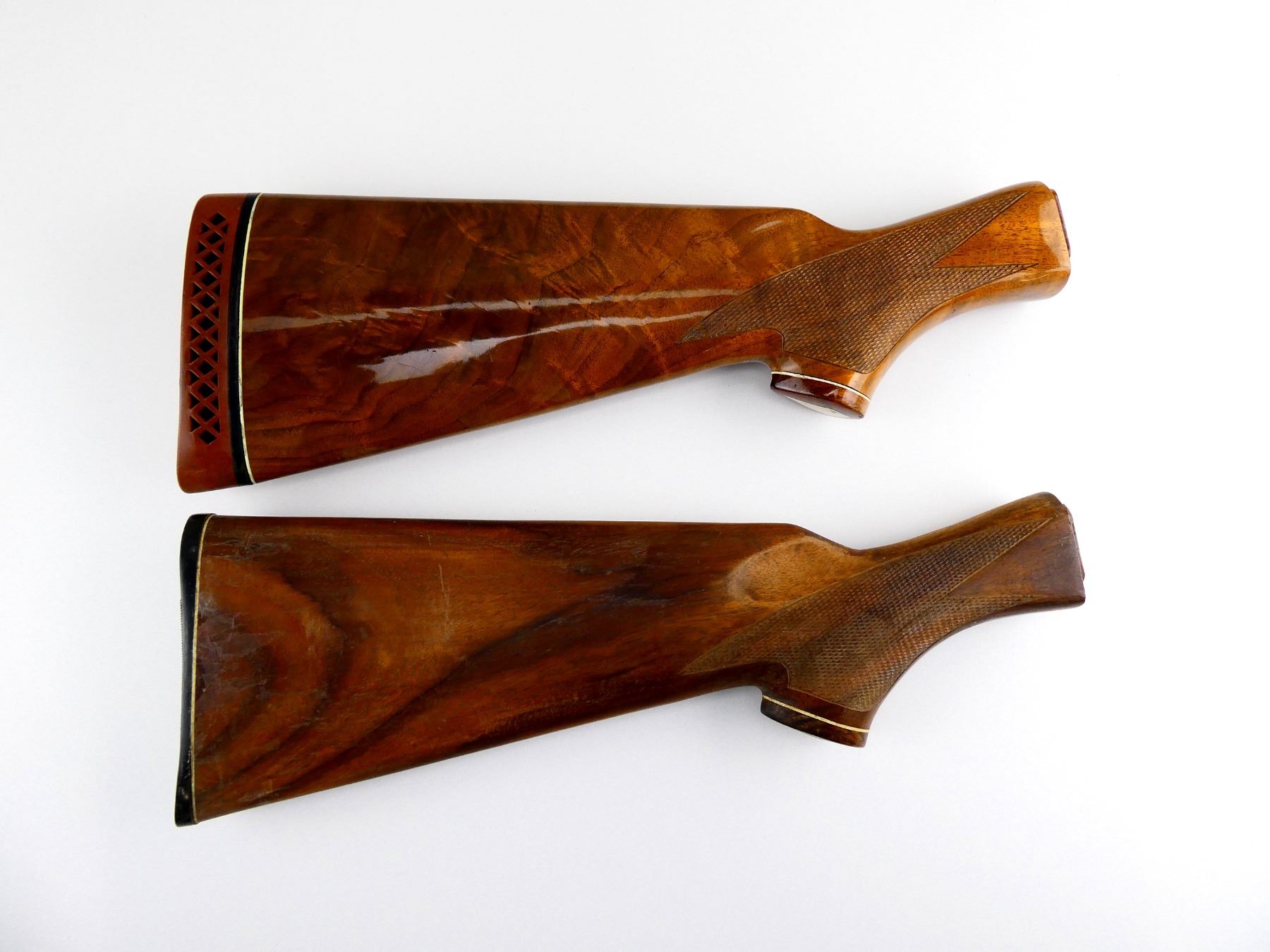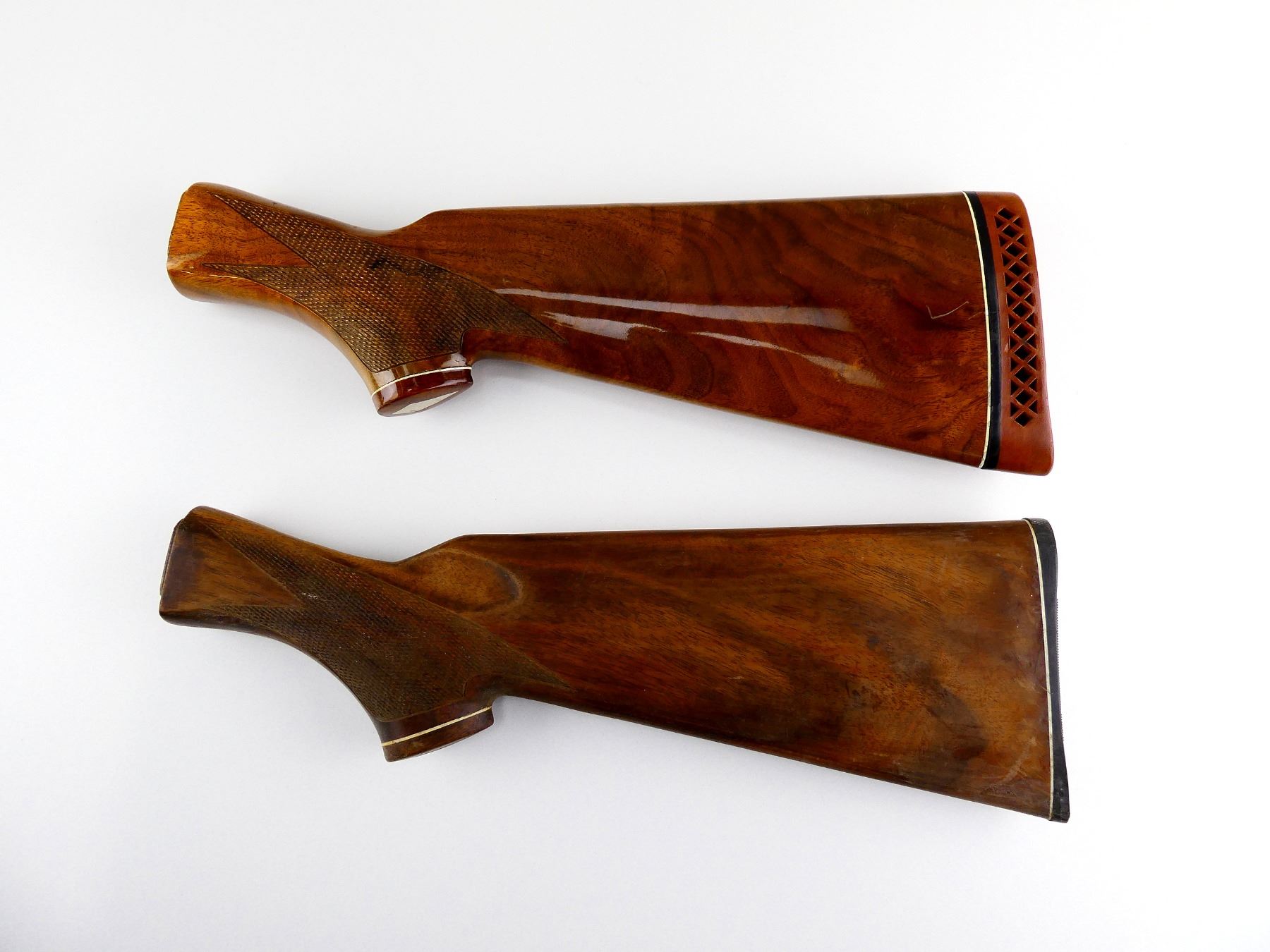 LOT INCLUDES; (2) WOOD CONSTRUCTION, CHECKERING ON GRIP, WITH WOOD GRIP CAPS, ONE WITH BUTT PLATE, OAL APPROX 14" / ONE WITH RECOIL PAD, APPROX. 14.25".MAY REQUIRE FITTING. SEE PHOTOS.