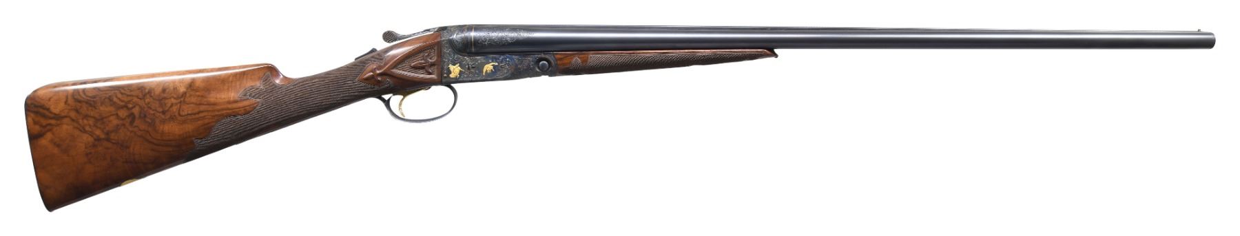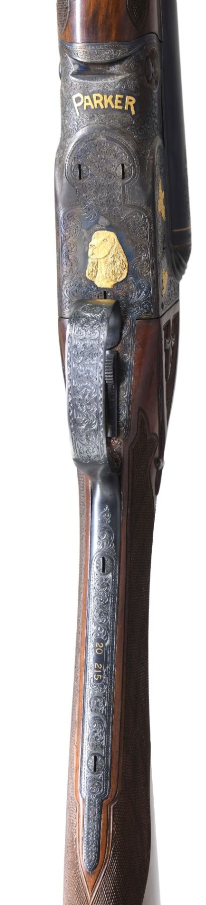 Cal. 20 ga. 2 3/4" & 3". S# 20-215. Bbl. 28" w/ fixed Mod & Full chokes. Brass front bead. Rib is marked "Parker Reproduction by WINCHESTER East Alton IL U.S.A.". Case colored boxlock action, having fancy fences. Left side of receiver features two raised gold woodcock. Left side has two flushing quail. Bottom of receiver has gold inlaid Parker marking w/ raised gold Spaniel portrait on floorplate. Balance of action is covered w/ scroll engraving & fancy borders that extend to trigger guard, forearm iron, breech end & muzzle end of bbls. Breech ends of bbls. also have a single gold band. Serial number on rigger guard is gold inlaid. Gold finished single selective trigger. Selective ejector. Steel tipped splinter forearm & straight grip stock of fancy walnut having orange & tan tones w/ vivid dark streaking. Elaborate wraparound 32 LPI hand checkering has fleur-de-lis highlights w/ raised carved fleur-de-lis on & behind stock ears. LOP: 14" to a checkered butt w/ engraved skeleton steel buttplate. DAC: 1 3/8". DAH: 2 1/4". Neutral cast. WEIGHT: 6 lbs, 12 oz. Limited Japanese mfg., 1988-1989. CONDITION: very fine, retaining over 98% wood & metal finish. Action shows slight edge wear. Stock shows a few small handling marks. Bright near excellent bores. (25-218/DS). CURIO. $12,000-18,000.