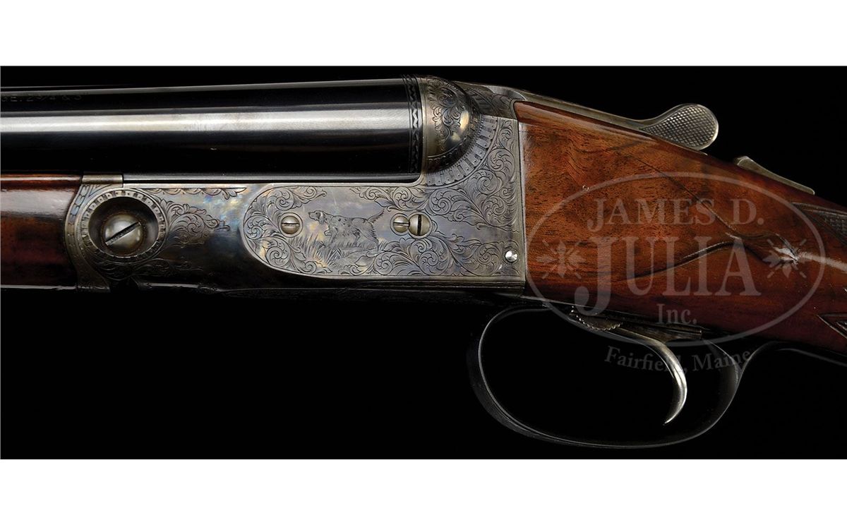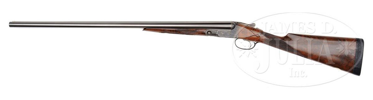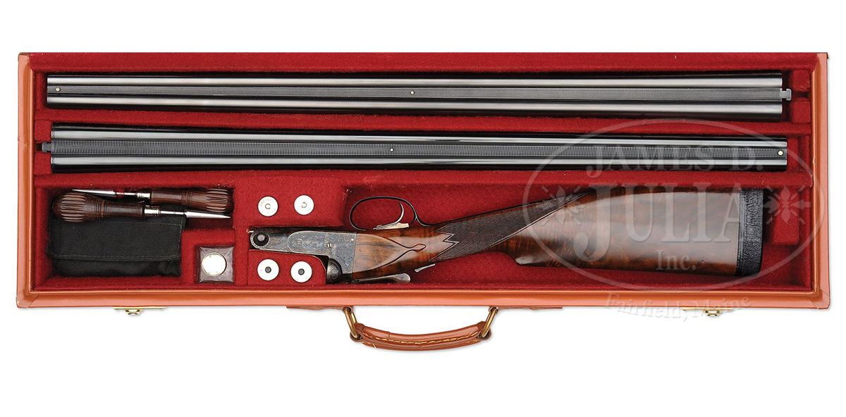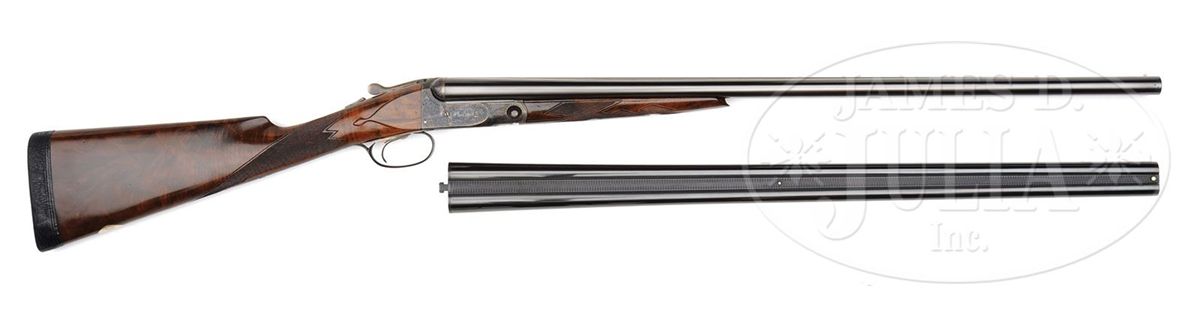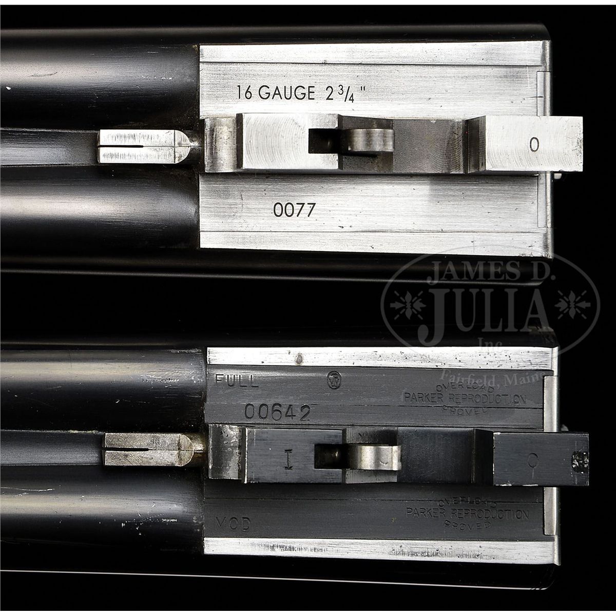 SN 00642. Cal. 20 ga./ 16 ga. 3" and 2-3/4" Chambers. 0 Frame. Both sets of 28" bbls have matted, concave ribs, fitted with two ivory beads. 20 ga. bbls are marked with typical Winchester Parker Reproduction nomenclature. 16 ga. bbls are unmarked except for caliber and SN on water table. (All 16 ga. bbls for Parker Reproductions were made by Krieghoff International, and were fitted to 20 ga. frames at Krieghoff's American facility in Pennsylvania. Approx 500 sets were produced, bbls were in their own SN range, not numbered to the guns. This set is number 0077.) Typical DHE action features non automatic safety and single selective trigger. Finely figured, and nicely marbled Claro walnut straight grip buttstock measures 14" over black leather covered pad, and features standard checkering and drop points. Gold oval on toe line is engraved "J. E. F." Matching splinter forend fits both bbl sets. 20 ga.: Bore diameter: left-.615, right -.615. Bore restrictions: Screw chokes. Wall thickness: left -.033, right -.035. Drop at heel: 2-3/16", drop at comb: 1-7/16". Weight: 6 lbs. 10 oz. LOP: 14". 16 ga.: Bore diameter: left-.669, right -.669. Bore restrictions: left -.016 (Mod), right -.010 (IC). Wall thickness: left -.035, right -.035. Drop at heel: 2-1/8", drop at comb: 1-1/2". Weight: 6 lbs. 6 oz. LOP: 14". Leather case with leather corners is lined in red felt. with Parker "Old Reliable" label. Case has space for gun and both bbl sets. Case contains high quality 2-pc rosewood and brass cleaning rod, two rosewood handled turnscrews, crystal oil bottle, 8 choke tubes (2 are in gun) in black cloth wallet and red plastic container, and a pair of snap caps for each bbl set. Gun is accompanied by Trevallion Gun Stocks hang tag. PROVENANCE: Once the property of noted writer, J. E. Fender, gun is accompanied by his description, a "Parker Reproductions" advertising page, and an exceptional, interesting, informative, but unpublished article entitled "A Labor of Love ..: Tom Skeuse and the Parker Reproduction Shotgun" outlining the story of reintroducing the Parker gun and the involvement of a number of interesting people, including Larry Baer and Dieter Krieghoff. CONDITION: Excellent. Bbls retain nearly all of their orig black. Action retains 98% of an exceptional re-color hardening replacing the shiny and thin colors normally found on Parker Reproductions. Engraving remains sharp. Stocks retain nearly all their orig finish with numerous slight marks and scratches from light field use, some extra oil rubbed into butt. Bores are excellent. Action is tight. Mechanically crisp. Case is excellent, with a few marks in leather. Cloth shows some light rubs and compressions from contact with gun. Accessories are excellent. 4-48900 MGM167