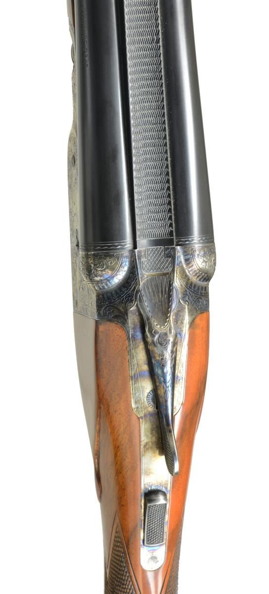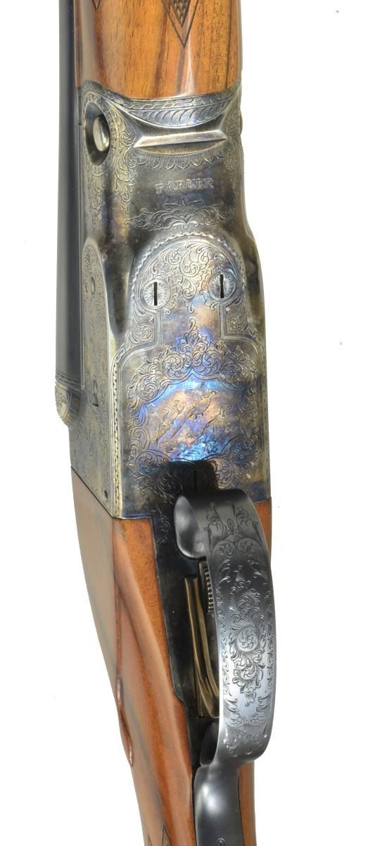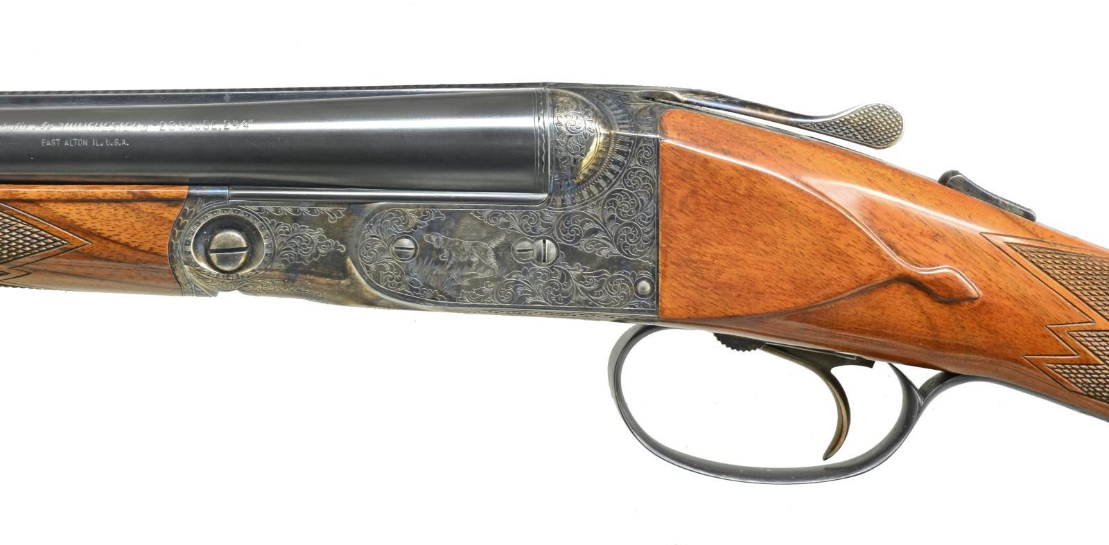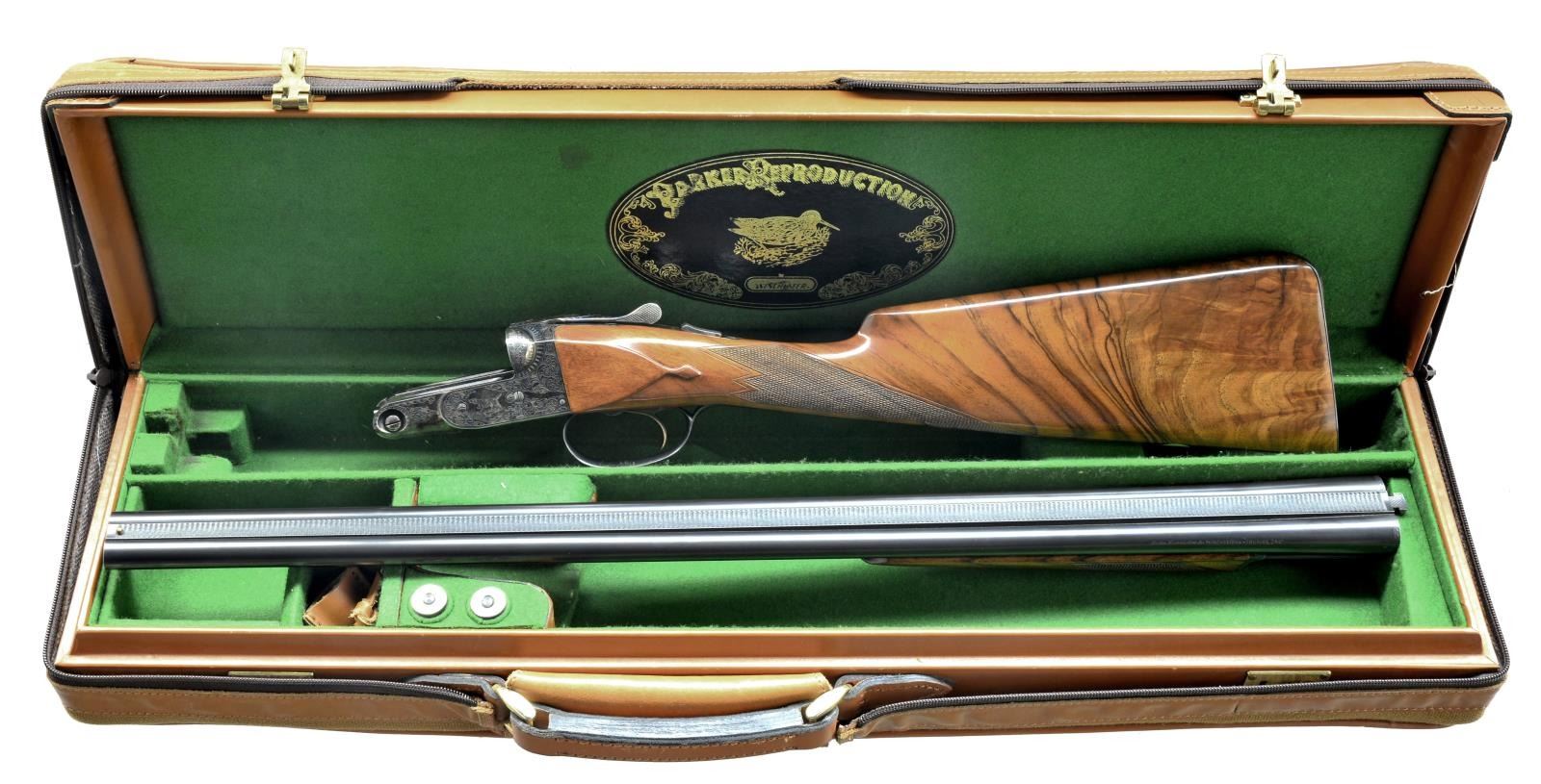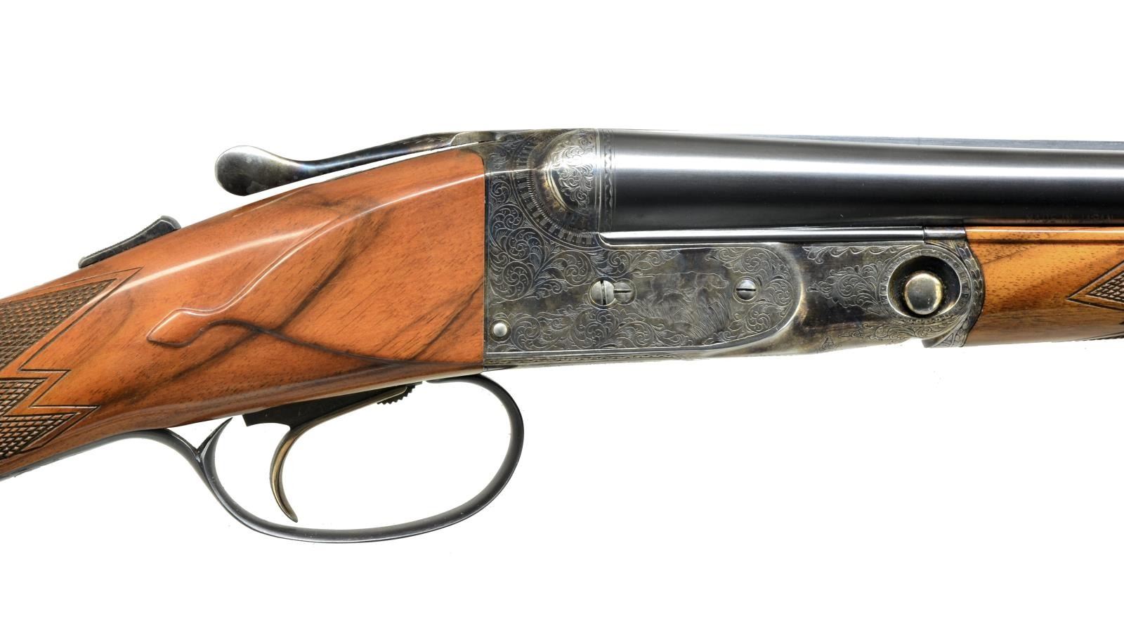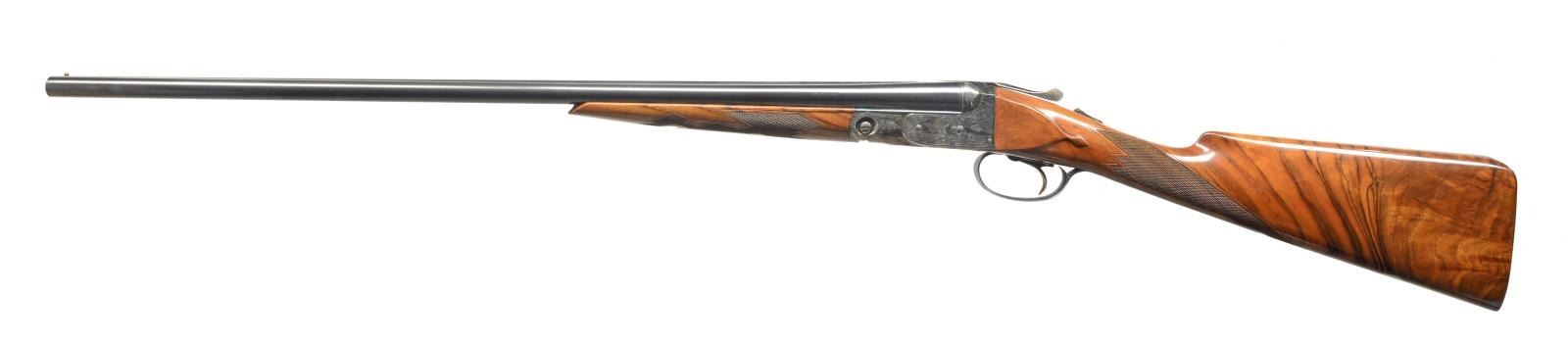 Cal. 28 Ga., 2 3/4" S# 28-01714. Bbls. 26" w/ fixed IC. & Mod. chokes. Brass front bead. OO Frame boxlock action. Engraving features pointer on right side, setter on left w/ flying pheasants on floorplate surrounded by foliate scroll that continues to trigger guard & forearm iron. Breech end of bbls. have borderline engraving. Case colored finish. SST. Selective ejectors. Splinter forend & straight hand stock of fancy walnut w/ gloss finish & point pattern hand checkering having oval name plate in toe line. LOP: 14 1/8" over checkered butt w/ engraved skeleton steel buttplate. Weight: 5 lbs., 9.7 oz. Limited mfg. 1983-1989 that offers the shooter a high quality alternative to using vintage guns. UNATTACHED ACCESSORIES: leather covered makers case w/ green felt fitted interior having original canvas cover. Case contains chrome finished snap caps. CONDITION: bbls. retains over 99% blue. Action retains 85% case colors showing silvering on edges & carry edges. Stock & forearm retain very good finish showing a few sm. marks. Bright near excellent bores. (20-3183/DS). MODERN. $3,500-4,500.