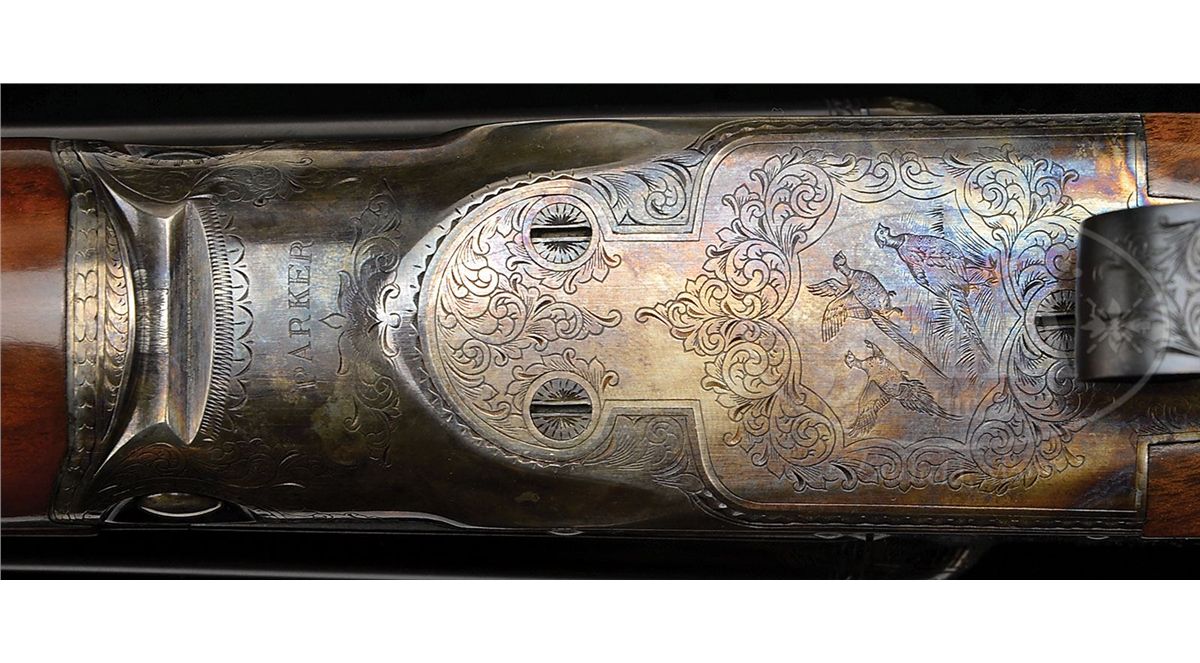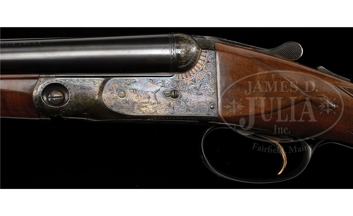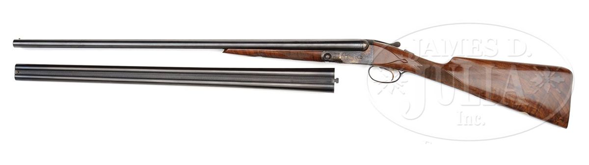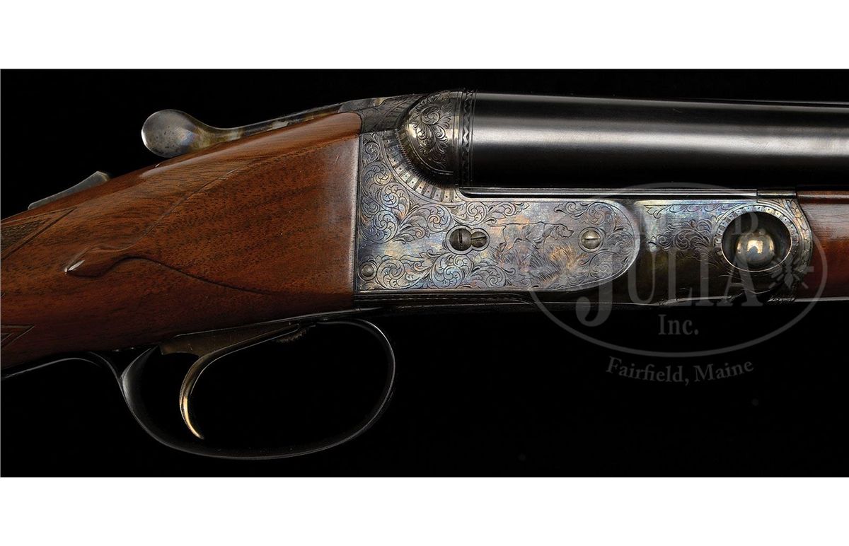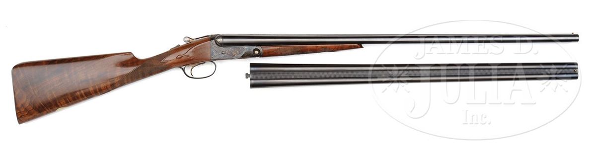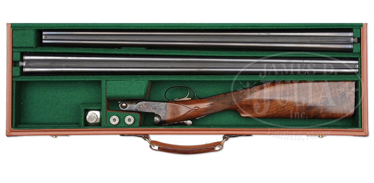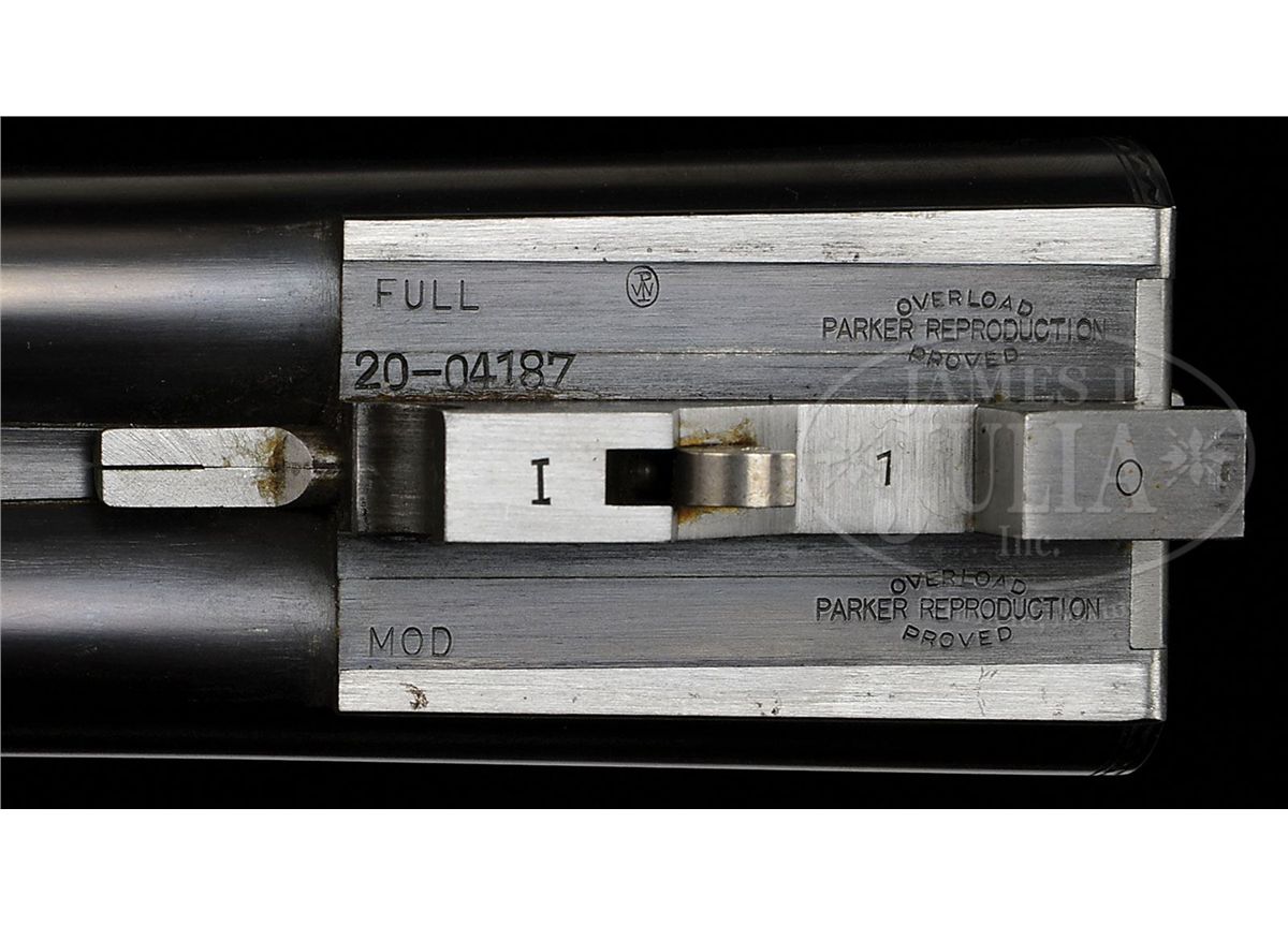 SN 20-04187. Cal. 20 ga. 26" Bbls with 2-3/4" chambers. 28" Bbls with 3" chambers, both with usual Winchester markings, and matted ribs, 0 frame case hardened action, straight grip, splinter forend, skeleton butt, and single selective trigger. Wood is nicely figured with light contrast. 26" Bbls: Bore diameter: left-.617, right -.617. Bore restrictions: left -.015 (Mod), right -.010 (IC). Wall thickness: left -.032, right -.030. Drop at heel: 2-1/8", drop at comb: 1-3/8". Weight: 6 lbs. 6 oz. LOP: 14-1/4". 28" Bbls: Bore diameter: left-.616, right -.617. Bore restrictions: left -.033 (Full), right -.016 (Mod). Wall thickness: left -.032, right -.031. Drop at heel: 2-1/8", drop at comb: 1-3/8". Weight: 6 lbs. 9 oz. LOP: 14-1/4". Typical Parker Reproduction case with canvas outer cover and black label on green felt interior cloth, has space for extra bbls, and contains Parker marked square oil bottle and snap caps, as well as two keys. CONDITION: Excellent. Bbls retain nearly all of their orig blue finish. Action retains 95% orig color, slightly silvered on fences, forend latch, and with a spot on bottom. Stocks have a few light marks and rubs. Bores are excellent. Mechanically crisp. Case is excellent. 4-49285 MGM100