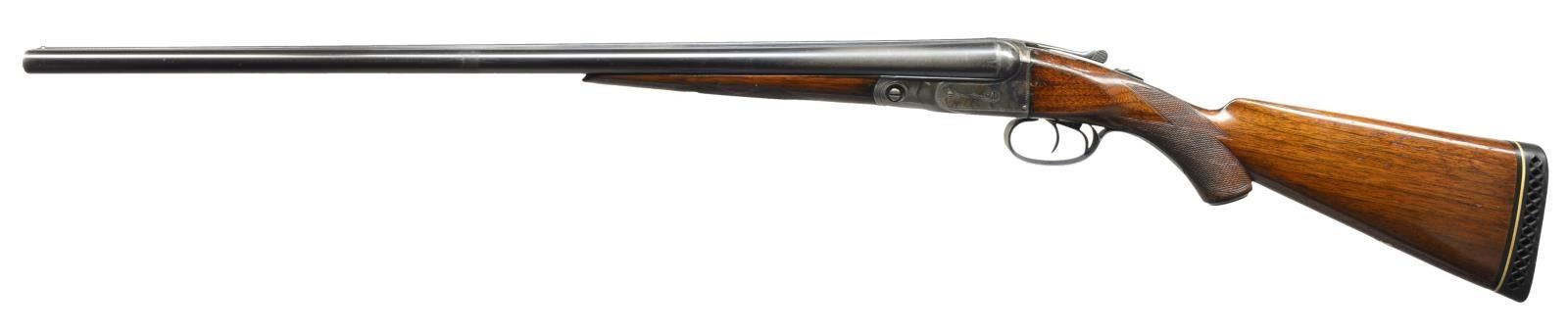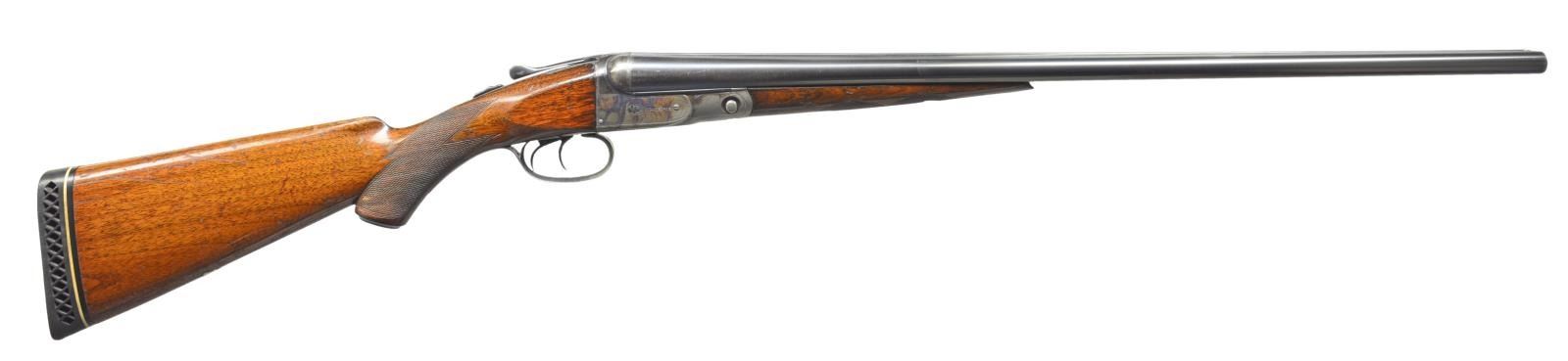 Cal. 20 Ga. S# 137429. Bbls. 26" of Vulcan fluid steel w/ fixed Mod. & Full chokes. Steel front bead. Case colored boxlock action w/ borderline engraving. Dbl. triggers. Extractors. Splinter forearm & hard rubber capped pistol grip walnut stock w/ hand checkering. Name shield in toeline of stock is marked "M". LOP: 14" over aftermarket Larry Del Grego & Sons recoil pad. DAC: 1 5/8". DAH: 3 1/16". Neutral cast. WEIGHT: 6 lbs., 1 oz. Mfg. 1906. CONDITION: early Larry Del Grego restoration. Receiver retains 70% case colors showing fading in carry areas. Bbls. retain 80% lightly faded blue. Right bbl. has sm. dent 5 3/4" from muzzle. Wood finish shows wear & crazing w/ scattered scratches, dents & marks. Bright bores. (21-1016/DS). CURIO. $2,000-3,000.