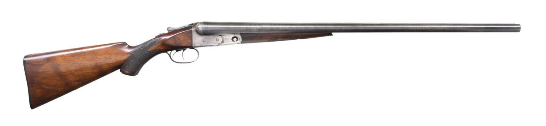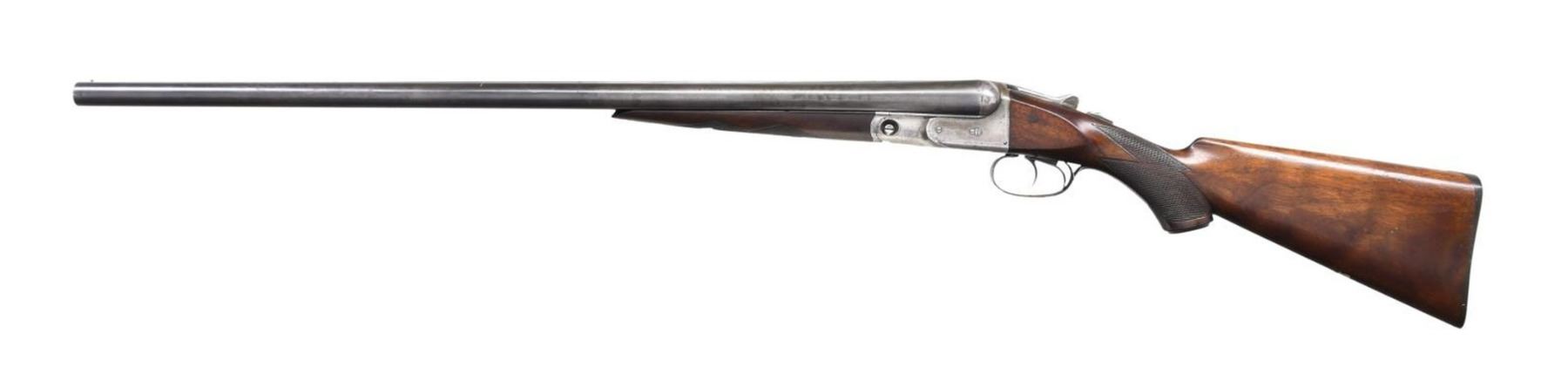 Cal. 12 ga. 2 5/8". S# 138337. Bbl. 28" Vulcan steel. A 1 1/2 frame with shorter bbls. Case-colored boxlock action on the desirable No. 1 1/2 frame. Action has V-grade borderline engraving. Double triggers. Extractors. Splintered forearm and capped pistol grip stock of checkered walnut with a name shield in the toeline. LOP: 14 1/4" over the dog's head buttplate. DAC: 1 3/4". DAH: 2 7/8". Neutral cast. Bore diameter: R 729, L 729. Choke constriction: R 041 L 040. Minimum wall thickness: R .031 L 032. WEIGHT: 6 lbs, 2.6 oz. Mfg. 1906. CONDITION: bbls. retain 40% of their dull, faded blue, showing scattered spots of light pitting and corrosion. Action has faded to gray, showing scratches. Wood checkered is faded, showing scratches and marks. Head of the stock shows plug-type repair with a chip behind the top tang. Bores show areas of dull finish and small spots of pitting. (24-1199/DS). CURIO. $700-1,000.