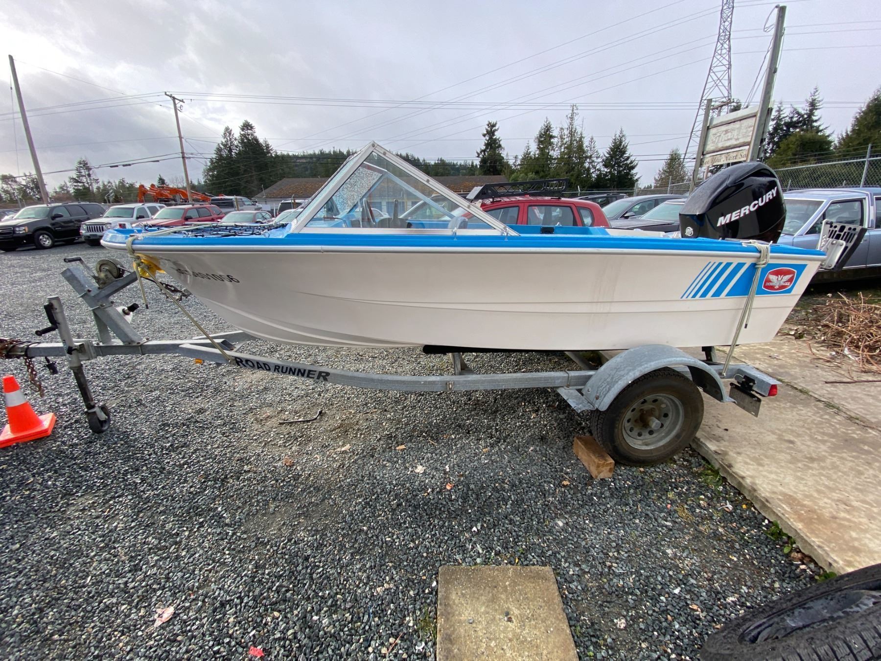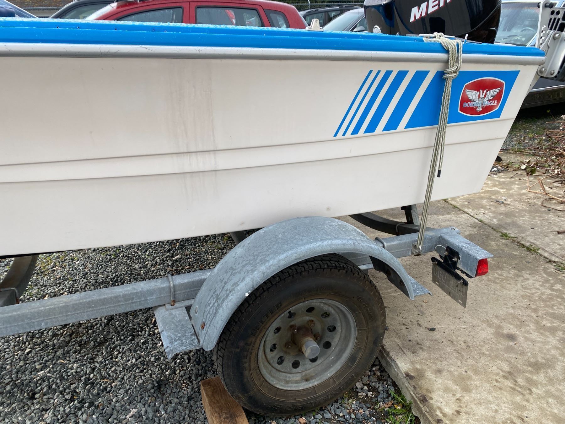 AUCTION NOTES: 14 FT BOAT COMES WITH A 50 HP MERCURY OUTBOARD 4 STROKE. ON A 18FT ROAD RUNNER TRAILER.