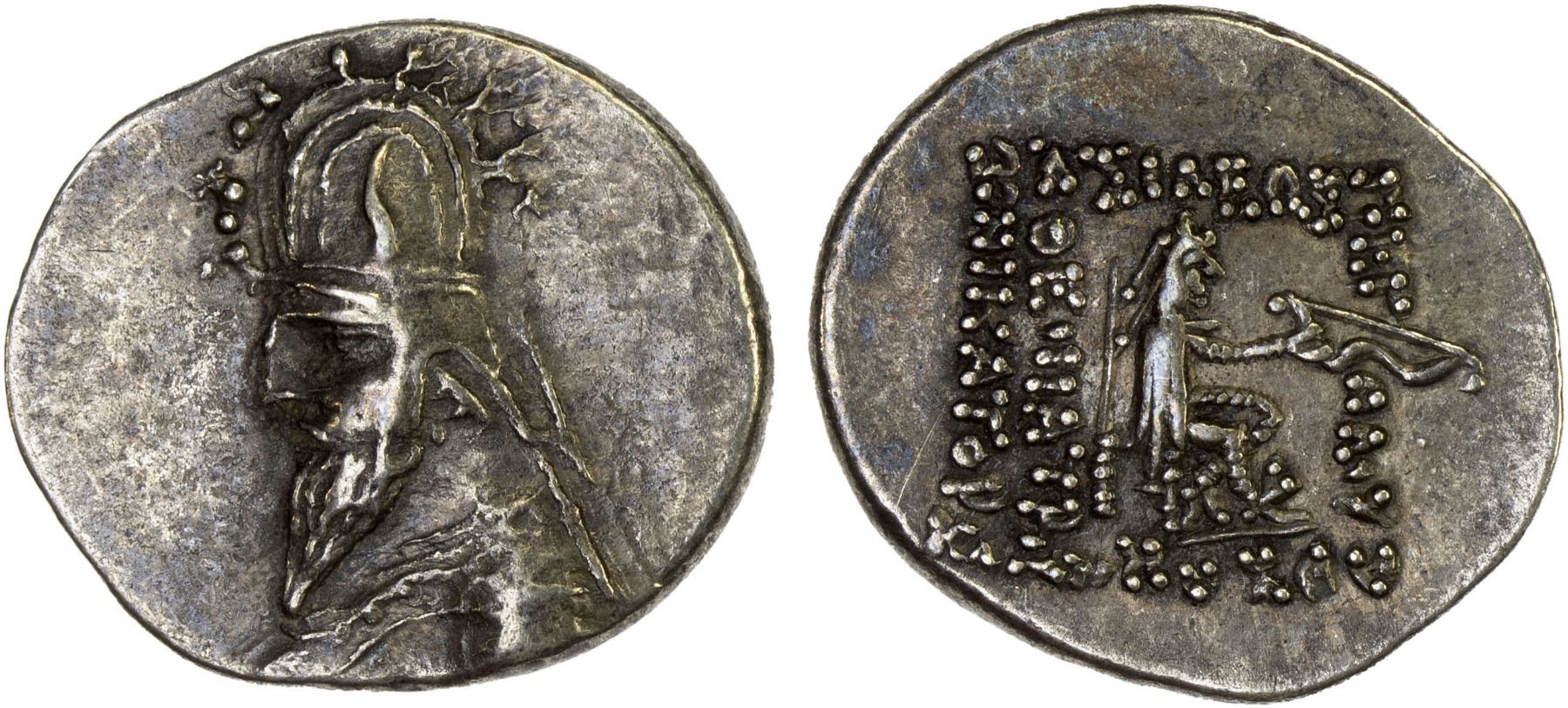 PARTHIAN KINGDOM: Gotarzes I, ca. 95-87 BC, AR drachm (3.96g), Shore-110/117, wearing tiara with horn in center, stags on top // 5-line legend around seated archer, VF-XF.