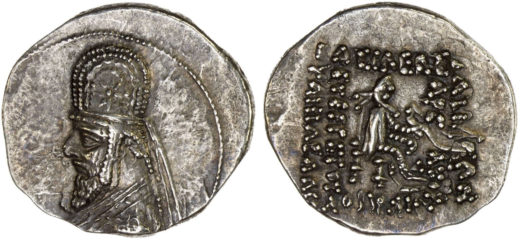 PARTHIAN KINGDOM: Mithradates II, c. 123-88 BC, AR drachm (4.26g), Shore-102/107, long-bearded bust left, wearing tiara crown with 8-point star in center and ear flaps, 6-line legend on reverse, VF-XF.