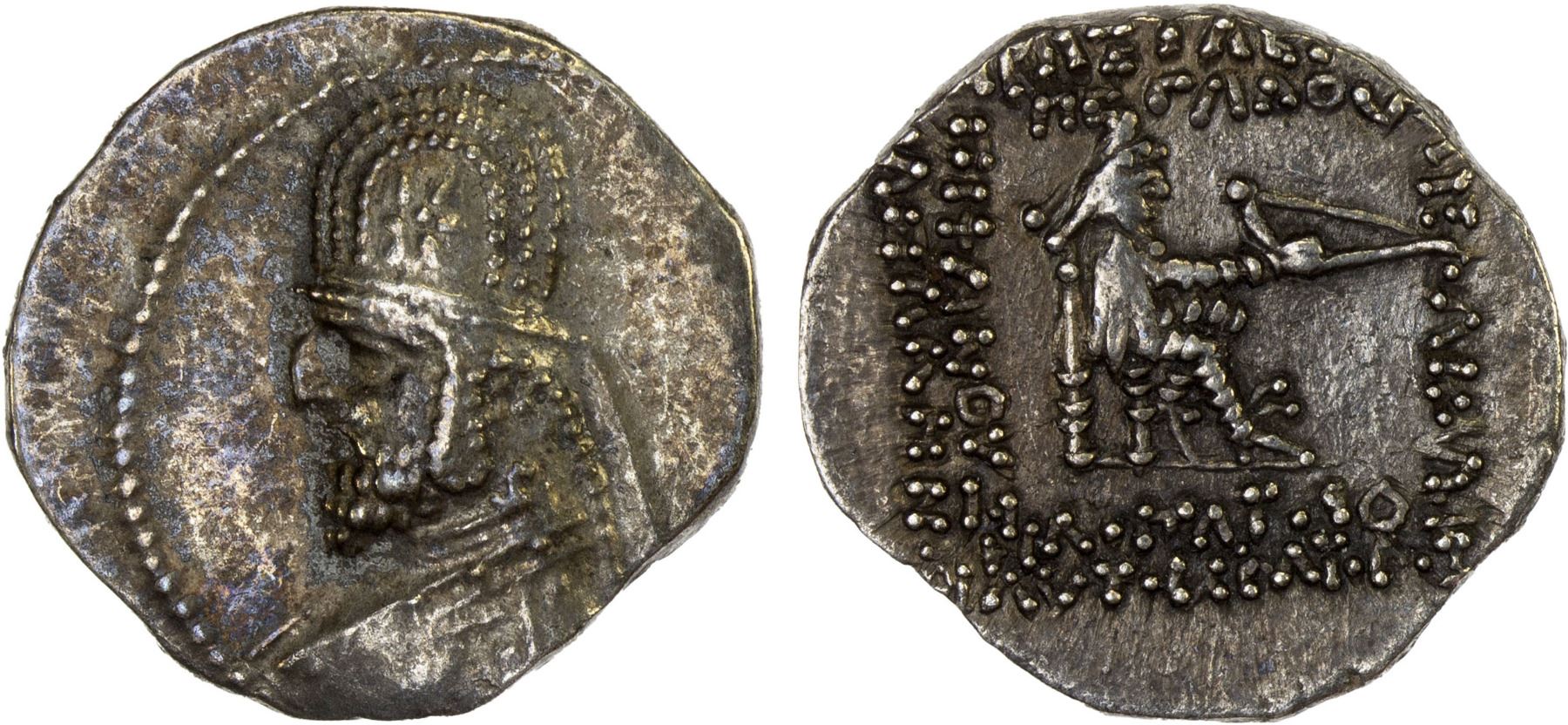 PARTHIAN KINGDOM: Orodes I, ca. 90-77 BC, AR drachm (4.07g), Shore-123/124, wearing tiara with 6-point star in center and earflaps, medium beard, 7-line legend on reverse, VF-XF.