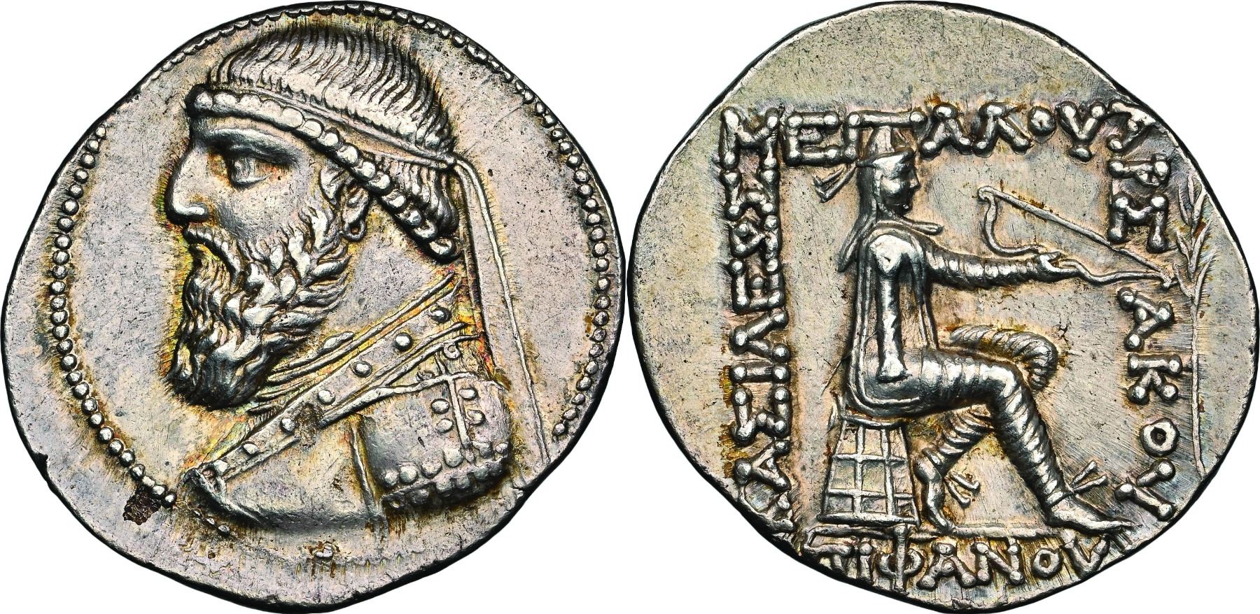 Revers : ΒΑΣΙΛΕΩΣ − ΜΑΓΑΛΟΥ − ΑΡΣΑΚΟΥ, Archer parthe assis à droite sur un omphalos, tenant son arc ; dans le champ extérieur à droite, une branche de palmier. À l'exergue, ΕΠΙΦΑΝΟΥΣ. Ref : Sellwood 24.3. Shore 66.