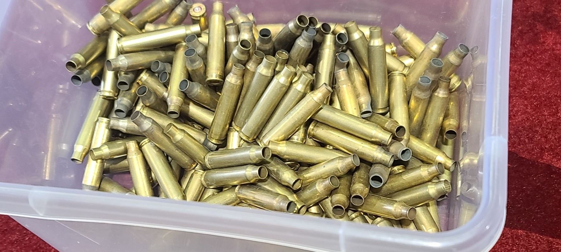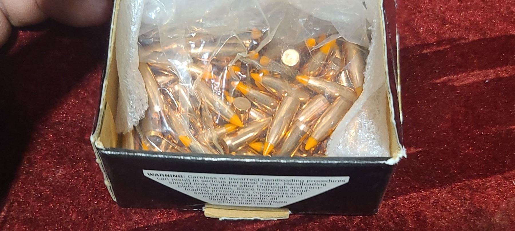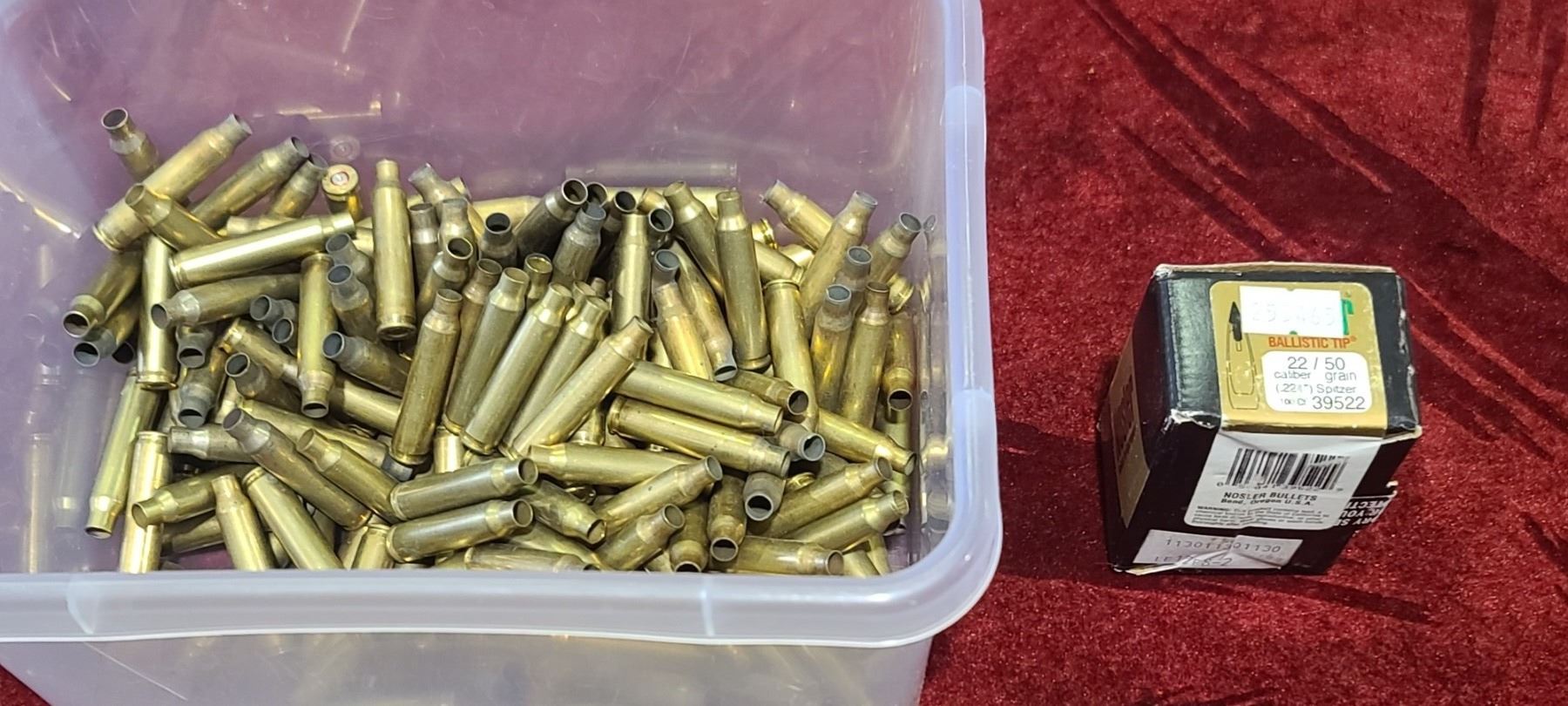 PARTIAL BOX OF NOSLER BALLISTIC TIP 22 BULLETS AND OVER 100 ASSORTED BRASS AND SOME WITH PRIMERS