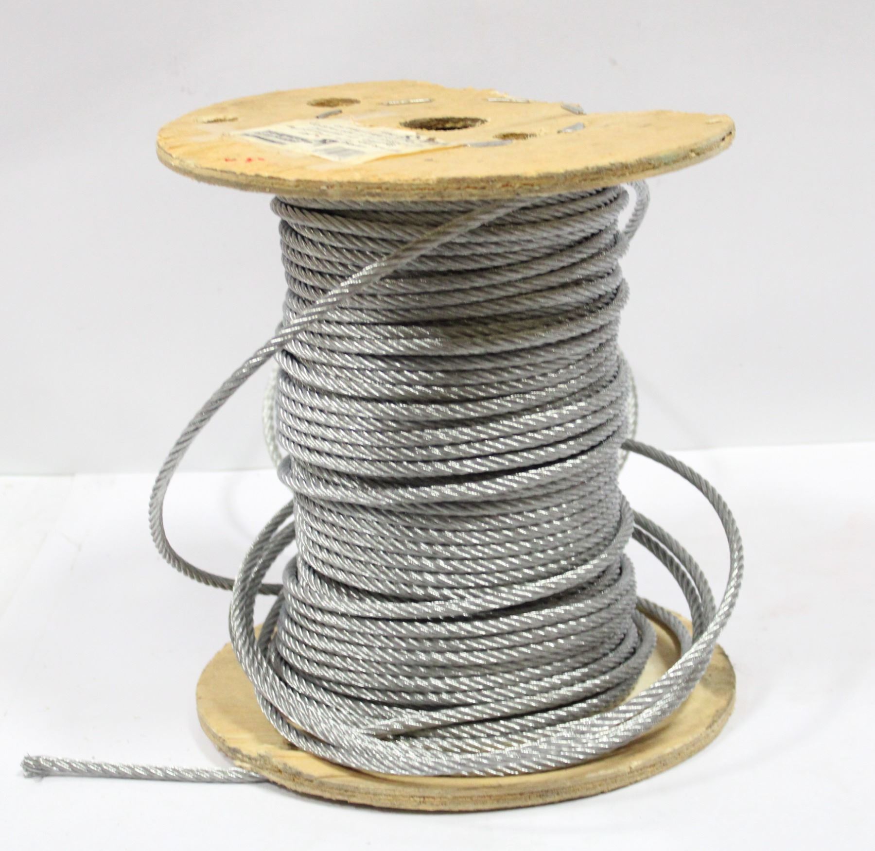 CONSTRUCTION 7X 19. DIAMETER 1/4". BREAKING STRENGTH 7000LBS. 500FT. *SIZE IS APPROXIMATE AND BASED OFF INITIAL SIZE, ROLL MAY BE DEPLETED*