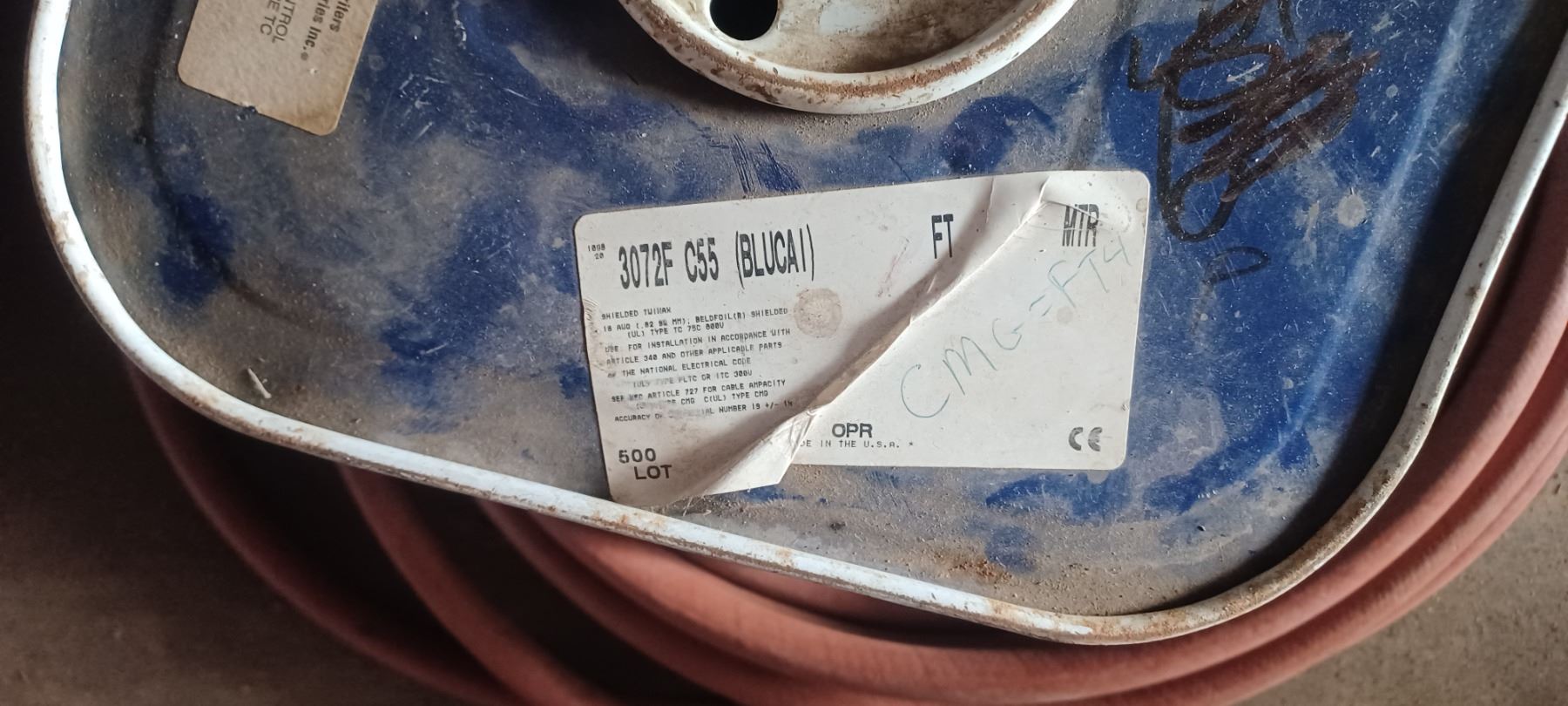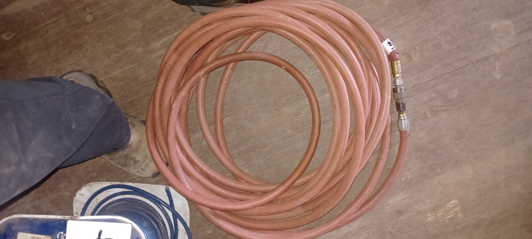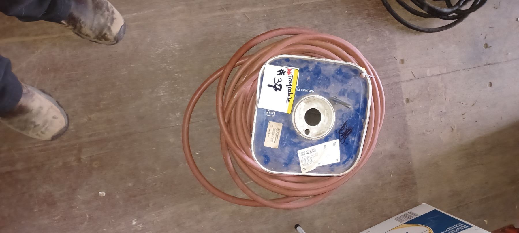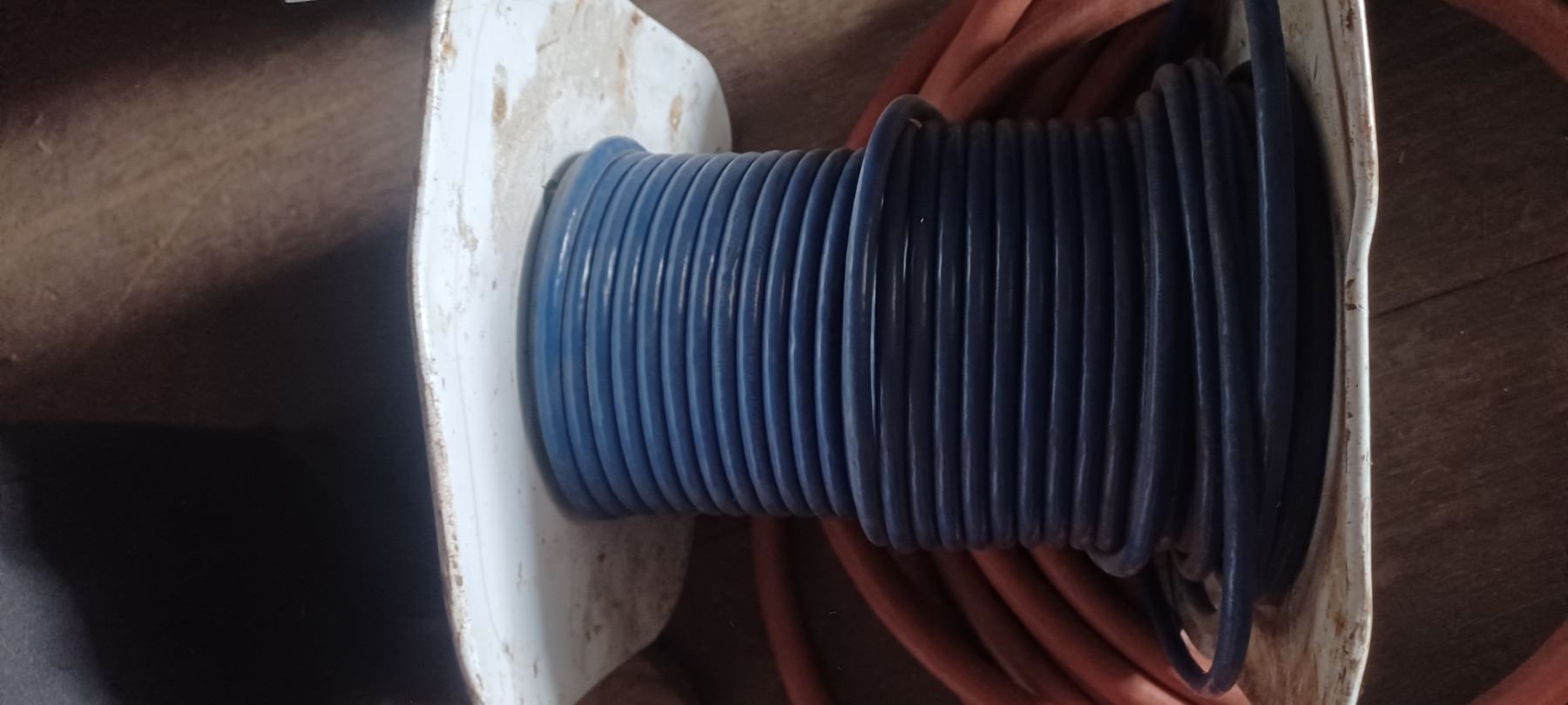 PARTIAL SPOOL OF BLUE WIRE AND AIR HOSE
