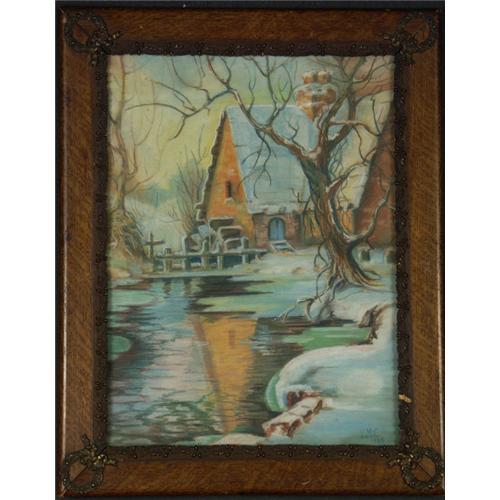 PASTEL ON PAPER 19 1/4'' x 14 3/8''. A House by the River. Circa early 20th century. Signed with initials ''V.M.C.'' and dated ''1938'' lower right. Placed in a period oak frame with metal detailing, as seen.