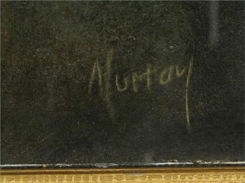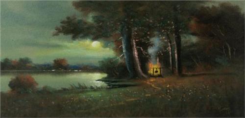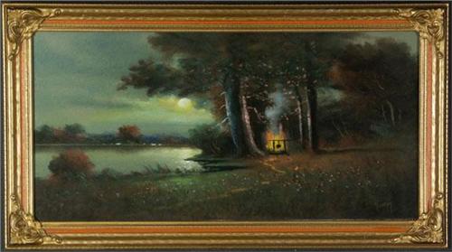 PASTEL ON PAPER 13 1/4'' x 27 1/4'', Murray. A campfire at the edge of a lake. Signed lower right corner. Early 20th century. Placed in a gilted frame with orange accents.
