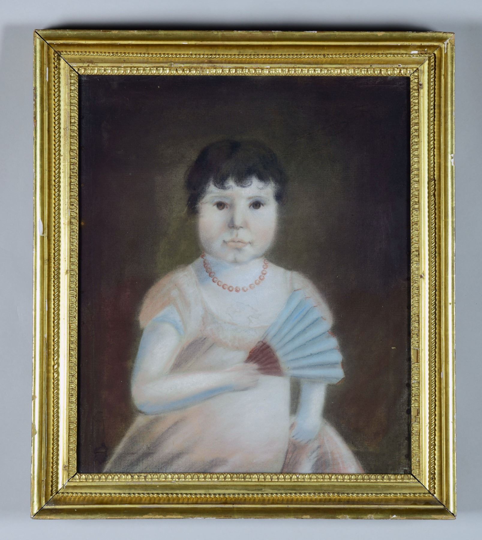 Circa 1825, New England. A pleasing folk art example of a young girl in empire style dress with blue fan and necklace. She has dark wavy hair and brown eyes. Unsigned. Housed in a gilt lemon gold frame under glass. SIZE: overall 27" x 23 1/2", sight 23" x 19". UNATTACHED ACCESSORIES: letter dated 1955 from The Mad Welshman's Antique Shop telling the owner about this painting in the shop. CONDITION: generally good with faint water stain at center of her chest. PROVENANCE: Farmington Falls, Maine Estate. (05-1125/TG). $500-1,000.
