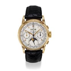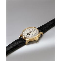 18K, NICKEL LEVER MOVEMENT, BIMETALLIC COMPENSATION BALANCE, 23 JEWELS, EIGHT ADJUSTMENTS, MOVEMENT STAMPED TWICE WITH SEAL OF GENEVA, SILVERED DIAL, APPLIED ARABIC NUMERALS, THREE SUBSIDIARY DIALS FOR CONSTANT SECONDS, 30-MINUTES COUNTER AND DATE COMBINED WITH MOON PHASES, APERTURES FOR DATE AND MONTH, OUTER SCALE CALIBRATED FOR TACHOMETER, CIRCULAR CASE WITH LARGE STEPPED LUGS, WITH PATEK PHILIPPE PINK GOLD BUCKLE SIGNED ON MOVEMENT,