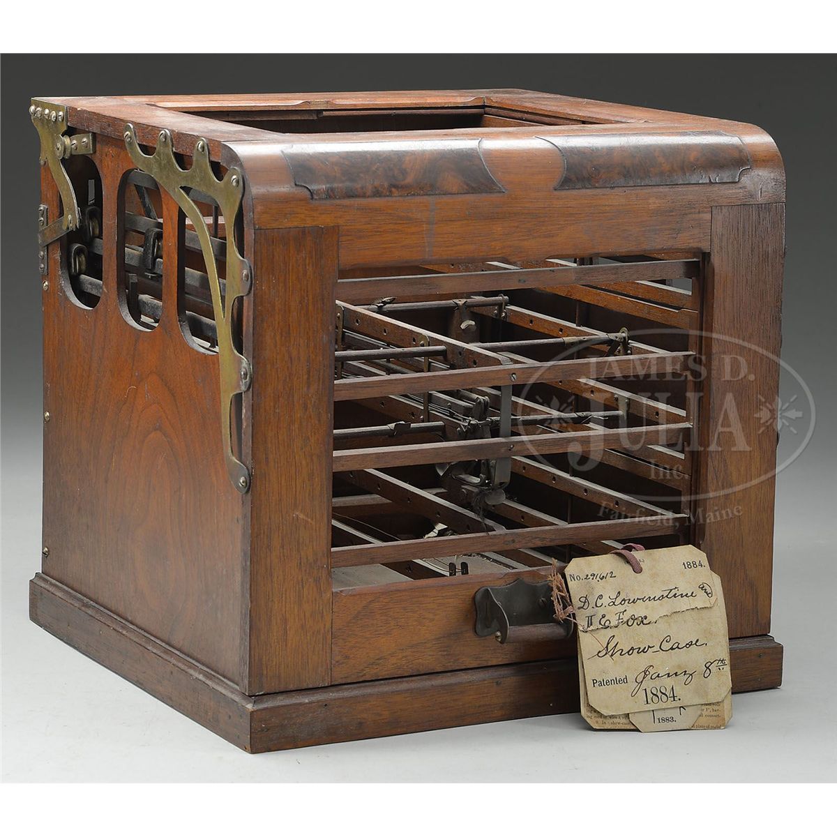 Patented January 8, 1884 by D. C. Lowenstine & J. E. Fox #291,612. Wooden flip top case with inlaid tiger maple accents, rounded corners, brass hardware and three pull out, flip up drawers. Accompanied by original patent and receiving tags (creased and torn). SIZE: 12" w x 11-1/2" h x 11" d. CONDITION: Very good plus. Appears to be lacking front and top glass. 1-13585