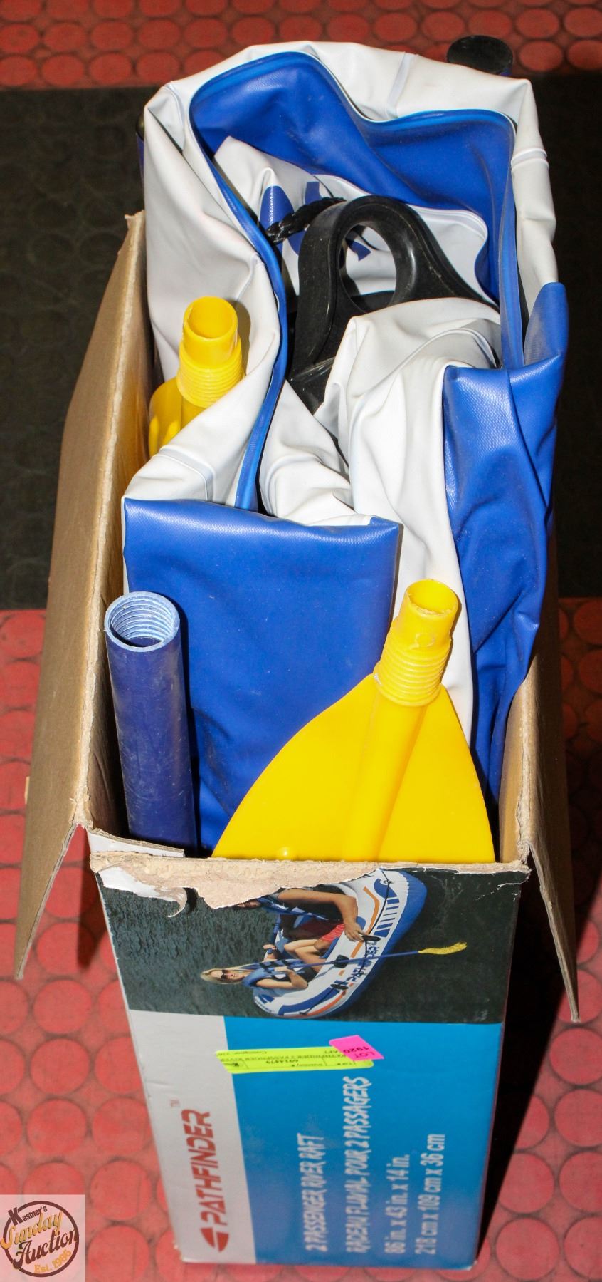 PATHFINDER 2 PASSENGER RIVER RAFT **ALL ITEMS MUST BE REMOVED BY 5PM SATURDAY, MAY 10TH 2025. ALL REMAINING ITEMS WILL BE SUBJECT TO A $6.00 PER DAY STORAGE CHARGE. ANY ITEMS REMAINING AFTER MONDAY, MAY 26TH 2025 WILL BE CONSIDERED FORFEITED. NO REFUNDS WILL BE ISSUED FOR FORFEITED ITEMS. TO SCHEDULE A PICK UP APPOINTMENT CLICK HERE
