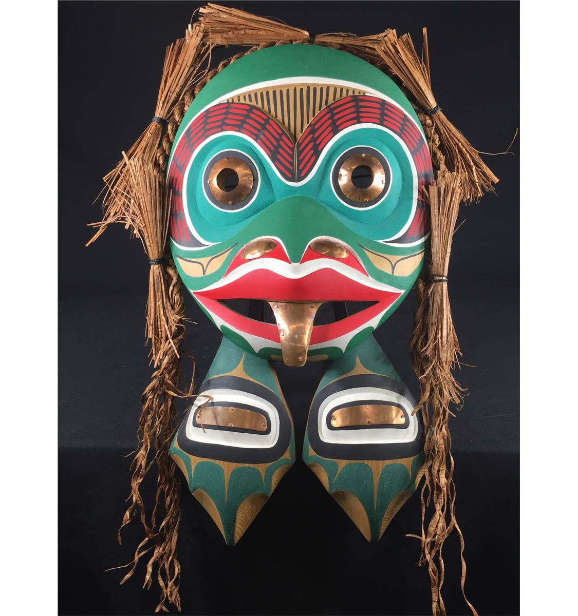 PATRICK AMOS, NUU-CHAH-NULTH, "FROG MASK", WITH COPPER AND CEDAR BARK ACCENTS 23" H X 14" W