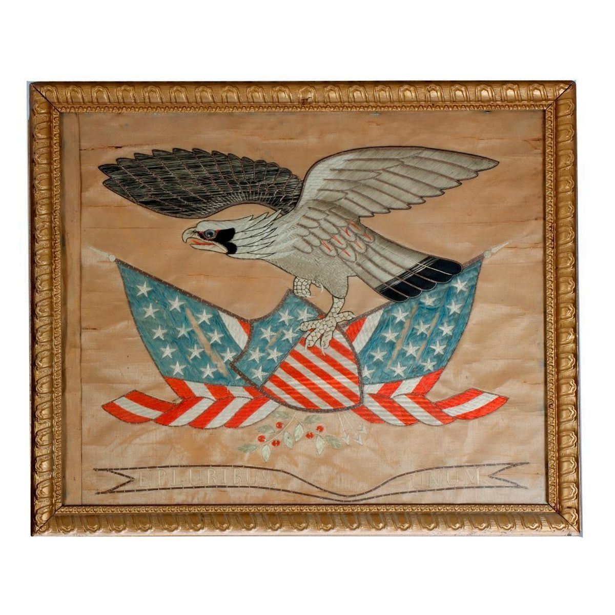 Circa Late 19th/Early 20th century, likely made in Japan. The eagle form is raised/padded, has a glass blue eye, and stands on a shield with two flags above an "E Pluribus Unum" banner. 17 1/2in. x 21 1/2in; 20 1/4in. x 24 1/4in. (frame). Condition: The silk panel has horizontal tears, some soiling/staining; fading; fraying/losses to embroidery on shield/flags; the eagle with one or two loosened threads, but overall good.
