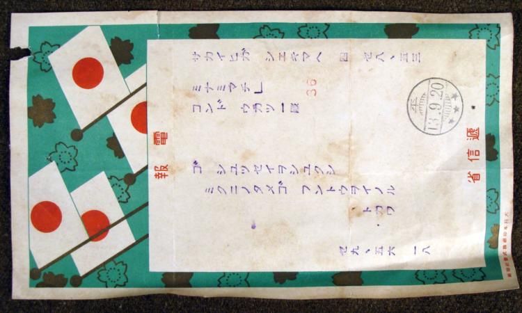 OFFERED HERE IS A PATRIOTIC JAPANESE LETTER FROM 1920. THE LETTER HAS JAPANESE FLAGS & MUMS ON FRONT. THERE ARE SEVERAL LINES OF KANJI AND THE POSTMARK STAMP IS DATED SEPT 13, 1920 POSTMARK STAMP. THE LETTER IS 9X5" WITH SOME RIPS AND TEARS ALONG THE EDGES. * * *