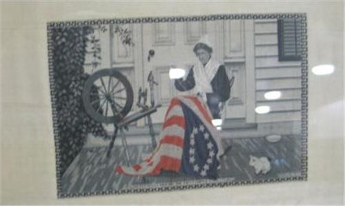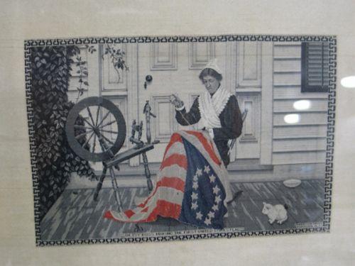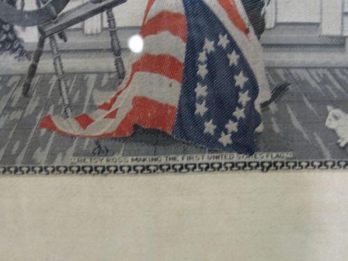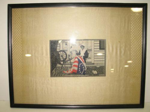 FRAMED PATRIOTIC LINEN PRINT. Depicts a sewn scene of Betsy Ross creating the flag of the United States of America. Scene is stitched to a cream linen backround. Scene is marked in lower right “Anderson Bros., Paterson, N.J.” 16.75” x 13” framed