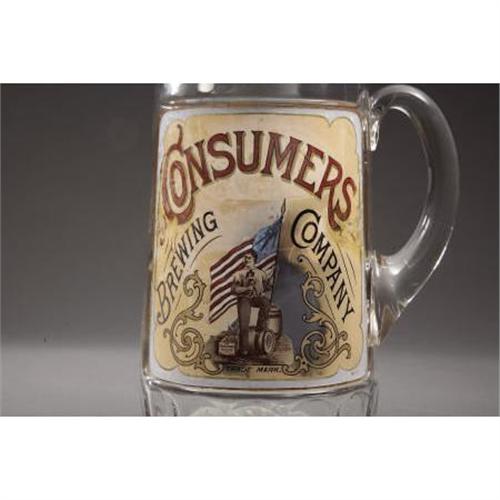 <B>"PATRIOTIC SALOON MUG"</B></I> - Label under glass display glass for “Consumers Brewing Co”; 10” tall with 6½” x 6½” panel; graphic of man with beer and American Flag.<I> From The George Jackson Collection.</B></I><BR><BR><B>Condition: </B></I>Colors good; major flaking on sides of image; several chips on rim.<BR><BR><b>Shipping:</b> Bottles, Jars & Containers (<a target="_blank" href="http://www.heritageauctions.com/common/shipping.php">view shipping information</a>)