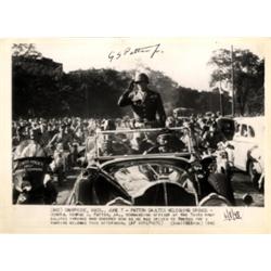 <b>208. GEORGE S. PATTON</b> Excellent war-date S.P. "<i>G S Patton Jr.</i>", 12" x 8" b/w showing Patton saluting the crowd from the back seat of an open car as he receives the crowd's acclaim while en route to Boston. An A.P. photo dated June 8, 1945 at bottom. Light vertical crease at center is virtually indistinguishable, else very good to fine condition.<b>$2,000-3,000</b>