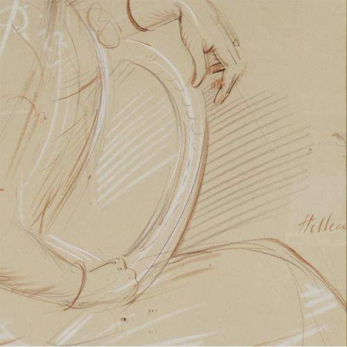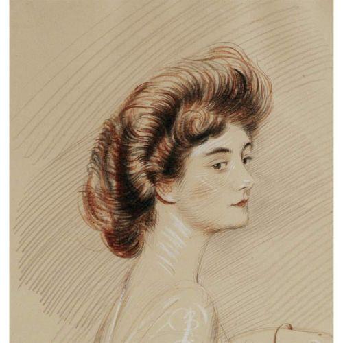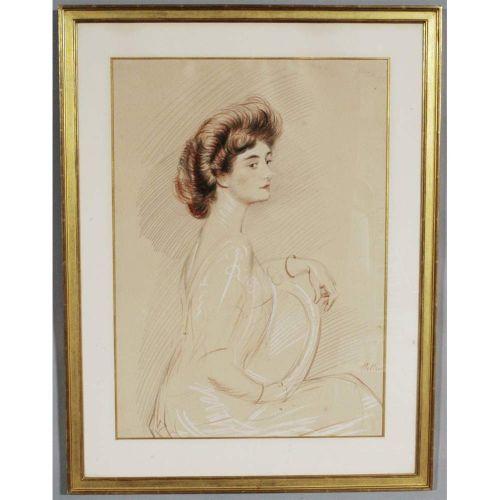 PAUL CESAR HELLEU 28"x20" sanguine, pencil and arabesque drawing of a Parisian beauty, signed lower right CONDITION REPORT: three tears extending into the sight along top edge- each less than 1/8" in image, a small surface lift tear (about 1/2" diameter) at right edge near bottom, otherwise clean and bright. Not inspected out of frame.