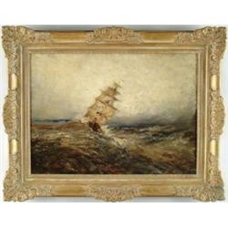 Lot # 1236 PAUL DOUGHERTY (American, 1877-1947) HEAD ON INTO THE STORM. Large oil on canvas marine scene shows tall ship coming at viewer through heavy ocean swells. Light reflecting in clouds indicate a lessening of the storm though sea in dark colors rages on. Signed lower left “Paul Dougherty”. Housed in what appears to be its outstanding original carved and gesso decorated gilt frame. Back of canvas in old writing indicates artist and “Address-Lester Studios 30? East 57th Street, NYC”. PROVENANCE: From a fine Baltimore, Maryland area home. SIZE: 22” x 30”. CONDITION: Very good. 9-98484 (5,000-10,000)