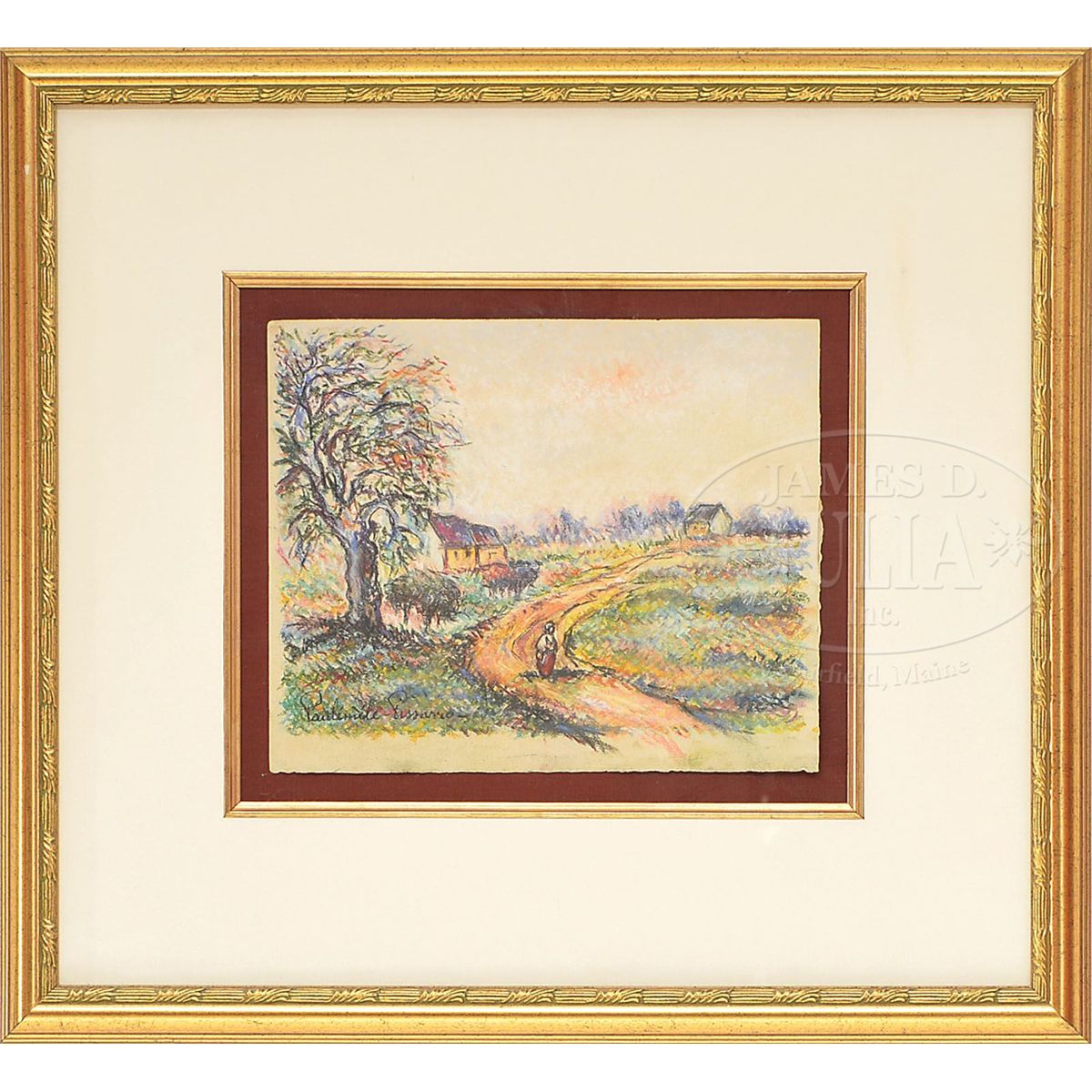 Pastel on paper Housed in a modern gilt frame with white matte and gold liner. Pastel is free mounted on burgundy background Signed "Paul Emile Pissaro", lower left Attached to verso: Certificate of authenticity from Katia Pissaro, dated 1987 SIZE: 9-1/2" x 11-1/2". Overall: 20-3/4" x 22-3/4" CONDITION: Very good 9-29989